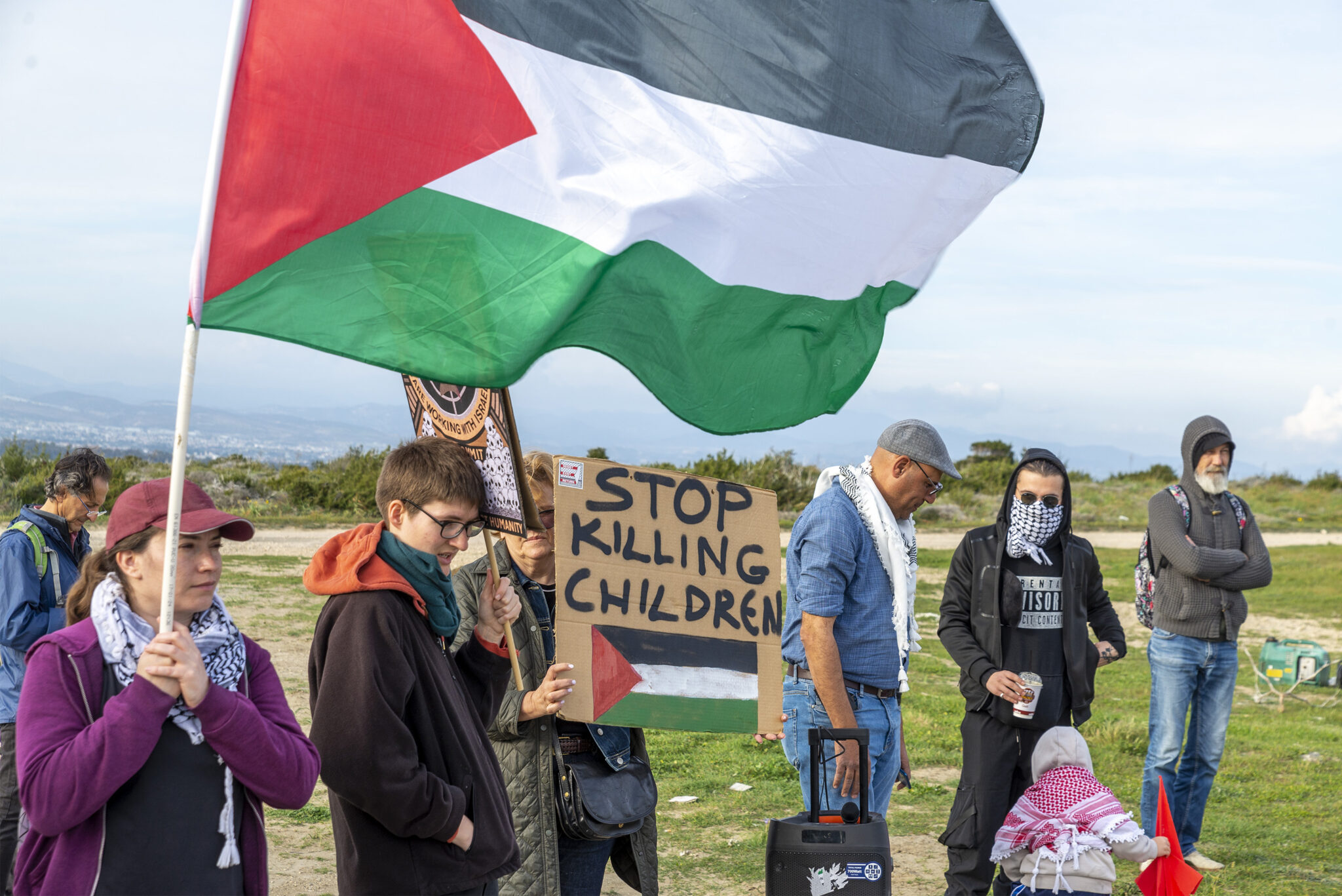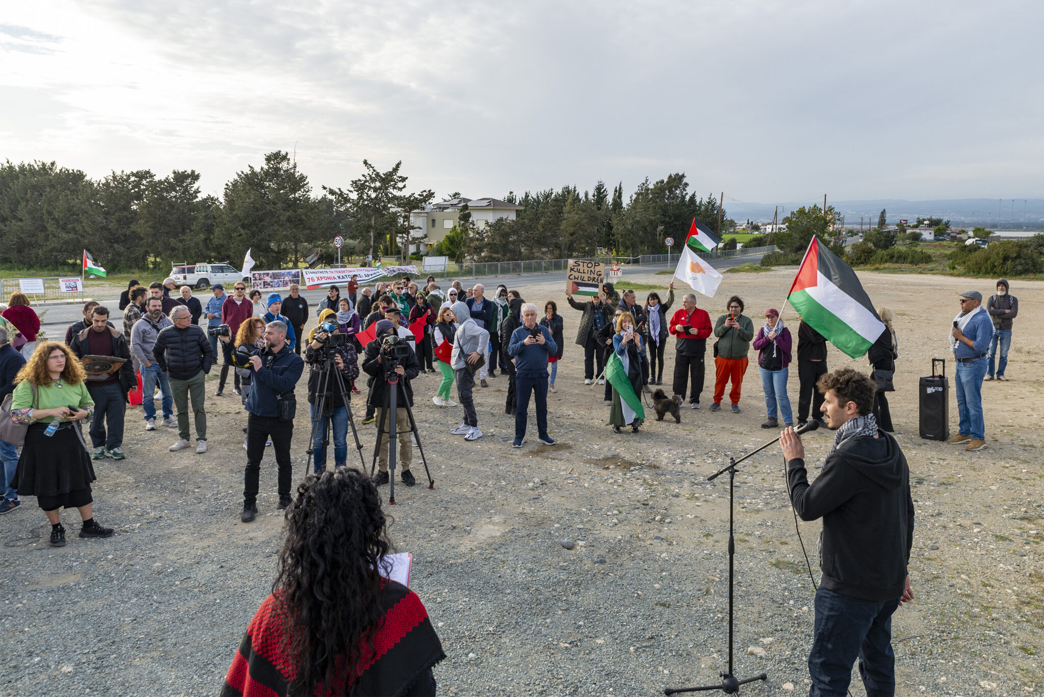 Κρατώντας σημαίες της Κύπρου και της Παλαιστίνης καθώς και πλακάτ με συνθήματα, περίπου 100 διαμαρτυρόμενοι πορεύθηκαν έξω από την είσοδο των Βρετανικών Βάσεων Ακρωτηρίου, φωνάζοντας συνθήματα όπως «Έξω οι Βάσεις του θανάτου», «Λευτεριά στην Παλαιστίνη», «Ένας είναι ο εχθρός, ο ιμπεριαλισμός» και «Δεν σας θέλει ο λαός, πάρτε τις Βάσεις σας και μπρος».