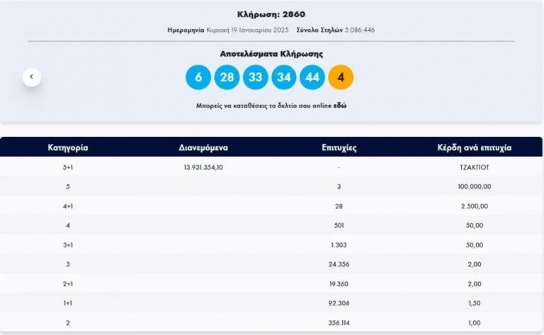 6, 28, 33, 34, 44 και Τζόκερ ο αριθμός 4.