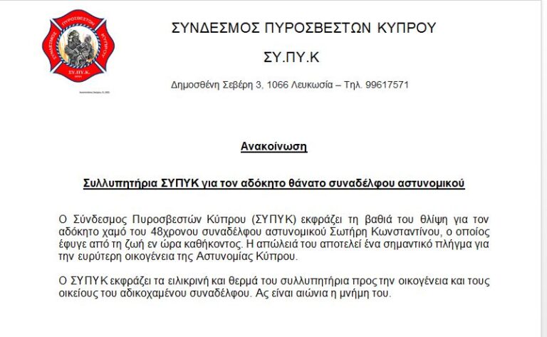 Σε ανακοίνωση, ο ΣΥΠΥΚ αναφέρει ότι «η απώλειά του 48χρονου αποτελεί ένα σημαντικό πλήγμα για την ευρύτερη οικογένεια της Αστυνομίας Κύπρου.»