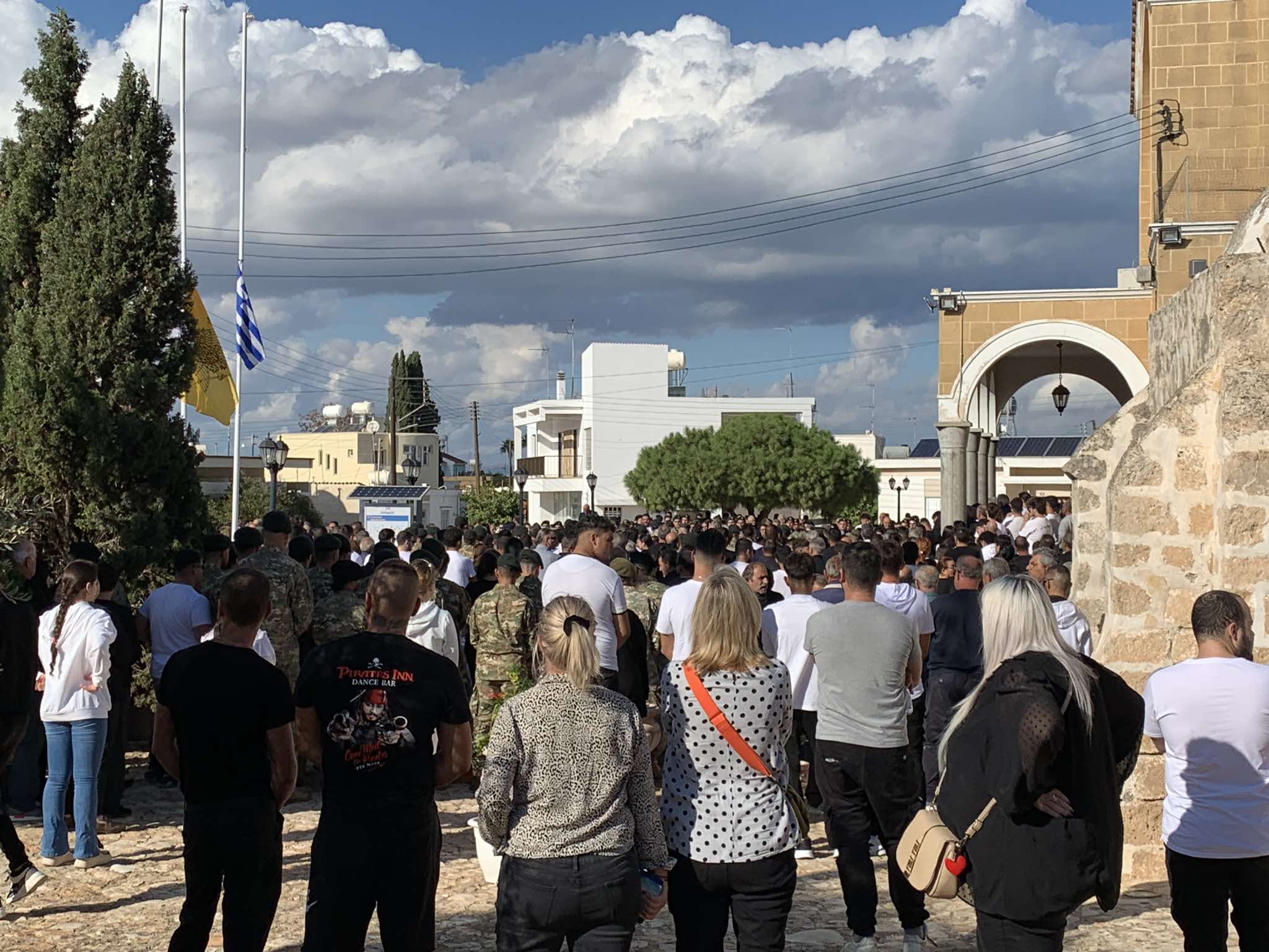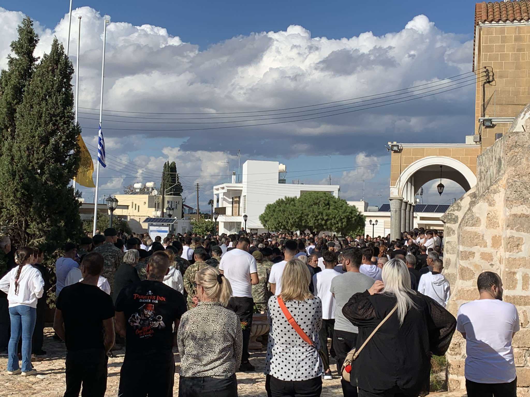 Στο προαύλιο του Ιερού Ναού είναι παραταγμένο άγημα της Εθνικής Φρουράς που αποτίει τιμές στον 18χρονο Νικόλα που υπηρετούσε τη στρατιωτική του θητεία.