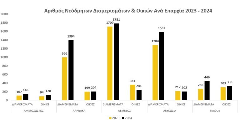 Τα πωλητήρια έγγραφα, που κατατέθηκαν και αφορούσαν αγορές καινούργιων κατοικιών (διαμερίσματα και οικίες) ανήλθαν σε 6.462, αυξημένα κατά 16,7% σε σύγκριση με το 2023. Αύξηση της τάξης του 4,9% καταγράφεται και στη συνολική αξία των πωλήσεων καινούργιων κατοικιών, η οποία ξεπέρασε τα €2 δισ.