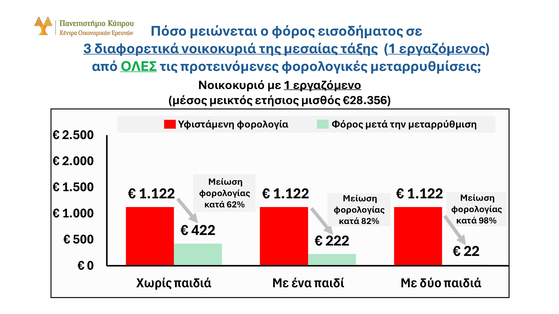 Στην περίπτωση νοικοκυριού με έναν εργαζόμενο και μέσο μεικτό ετήσιο μισθό €28,356 και με ένα παιδί ενώ με την υφιστάμενη φορολογία πλήρωνε €1,122 με την νέα φορολογική μεταρρύθμιση θα πληρώνει €222. Το ίδιο νοικοκυριό με δυο παιδιά θα πληρώνει φόρο μόλις €22.
