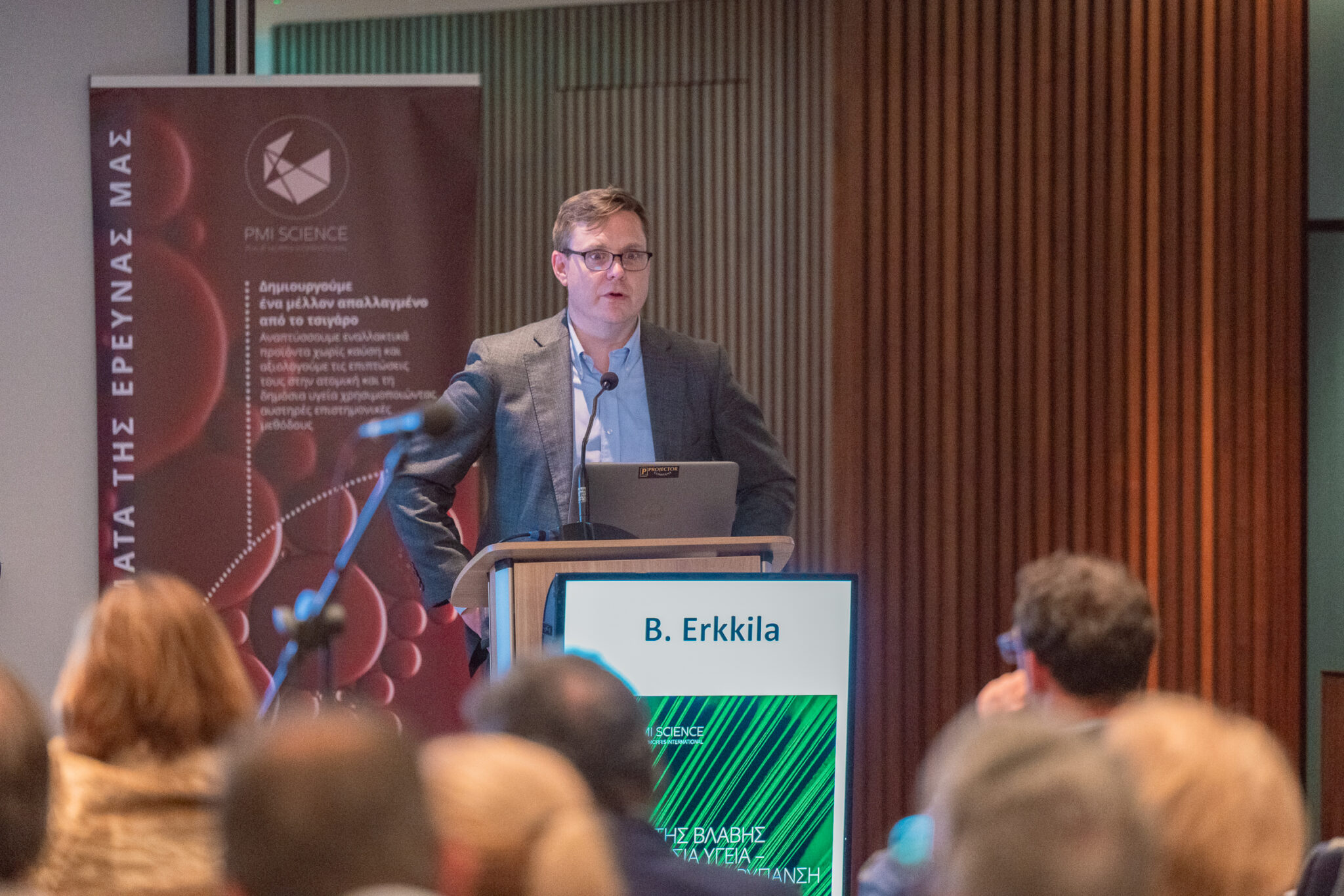 Από την πλευρά του, ο Brian Erkkila, Director of Regulatory Science, Philip Morris International, USA, 25 χρόνια ερευνητής στο πεδίο της νικοτίνης και του καπνίσματος, στην ομιλία του ανέπτυξε το πώς η μείωση της βλάβης από το κάπνισμα μπορεί να ωφελήσει τη δημόσια υγεία. Αναφέρθηκε στην επιστημονική έρευνα πολλών χρόνων της Philip Morris, η οποία αντλεί έμπνευση από τις αναγνωρισμένες πρακτικές της φαρμακοβιομηχανίας και βασίζεται στους κανόνες των ρυθμιστικών αρχών των μεγαλύτερων χωρών του κόσμου. Ο Οργανισμός Τροφίμων και Φαρμάκων (FDA) των ΗΠΑ, που προωθεί τη μείωση της βλάβης από το κάπνισμα, απαιτεί εκτεταμένα επιστημονικά στοιχεία που να αποδεικνύουν ότι τα εναλλακτικά προϊόντα αποτελούν μια λιγότερο επιβλαβή λύση από το τσιγάρο προκειμένου τα τελευταία να θεωρηθούν «Κατάλληλα για την Προστασία της Δημόσιας Υγείας» και να επιτραπεί η κυκλοφορία τους στην αγορά. Ο Brian Erkkila επανέλαβε ότι: «είναι τεκμηριωμένο πως η νικοτίνη, παρότι εθιστική και όχι ακίνδυνη, δεν αποτελεί την κύρια αιτία των ασθενειών που σχετίζονται με το κάπνισμα, αλλά τα υψηλά επίπεδα τοξικών συστατικών που παράγονται κατά την καύση του τσιγάρου. Τα προϊόντα χωρίς καύση, όπως τα ηλεκτρονικά τσιγάρα, τα προϊόντα θέρμανσης καπνού, το snus και τα σακουλάκια νικοτίνης, που δεν καίνε τον καπνό είναι μια καλύτερη εναλλακτική λύση από τo τσιγάρo για τους ενήλικους καπνιστές». Καταλήγοντας, τόνισε την αξία της ενημέρωσης των καπνιστών και της πρόσβασής τους σε επιστημονικά δεδομένα, καθώς και τη σημασία της διαθεσιμότητας προϊόντων με αδειοδοτημένους ισχυρισμούς μετά από αυστηρή επιστημονική αξιολόγηση προϊόντων, αποδεκτών από τους καπνιστές, ώστε η μείωση της βλάβης από το κάπνισμα να παίξει ρόλο στη μείωση των ασθενειών που σχετίζονται με το κάπνισμα.