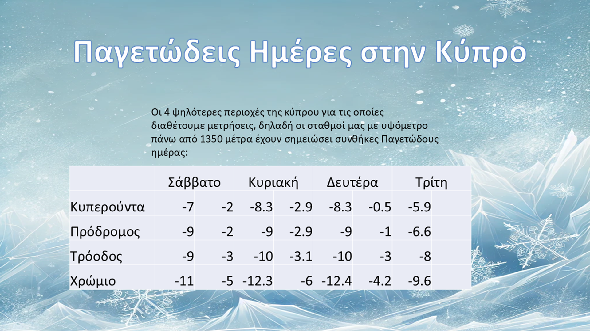 Στον πίνακα που ακολουθεί, φαίνονται οι πιο παγετώδεις ημέρες στους τέσσερις υψηλότερους σταθμούς του Τμήματος Μετεωρολογίας. Πρόκειται για τις περιοχές της Κυπερούντας, του Προδρόμου, του Τροόδους και του Χρώμιου, με τα δεδομένα τεσσάρων συνεχόμενων ημερών.