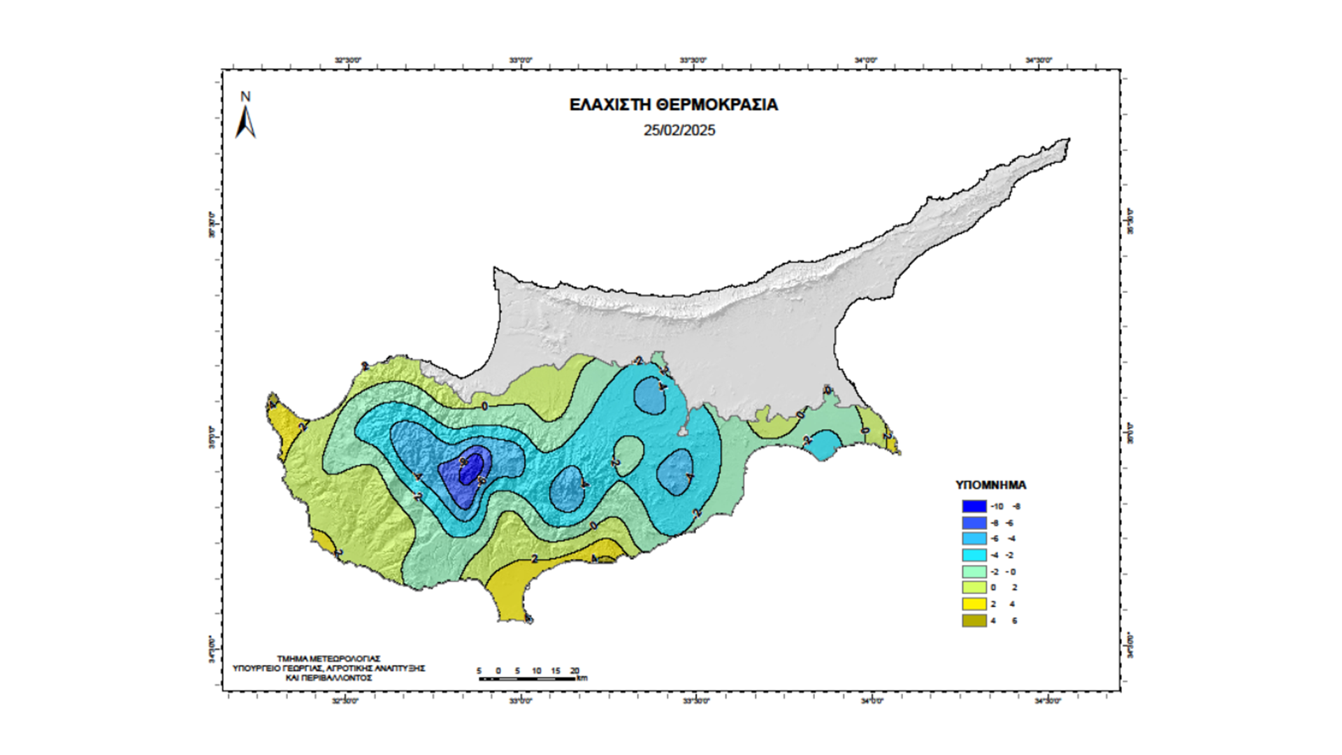 Θερμοκρασίες ρεκόρ είχαμε σε χαμηλές περιοχές, λέει ο κ. Τύμβιος και επηρεάστηκαν και περιοχές της ανατολικής Κύπρου, όπως επηρεάστηκε και η Λευκωσία. Στον χάρτη που ακολουθεί, φαίνονται αναλυτικά οι θερμοκρασίες της πιο ψυχρής ημέρας, η οποία ήταν στις 25 Φεβρουαρίου.