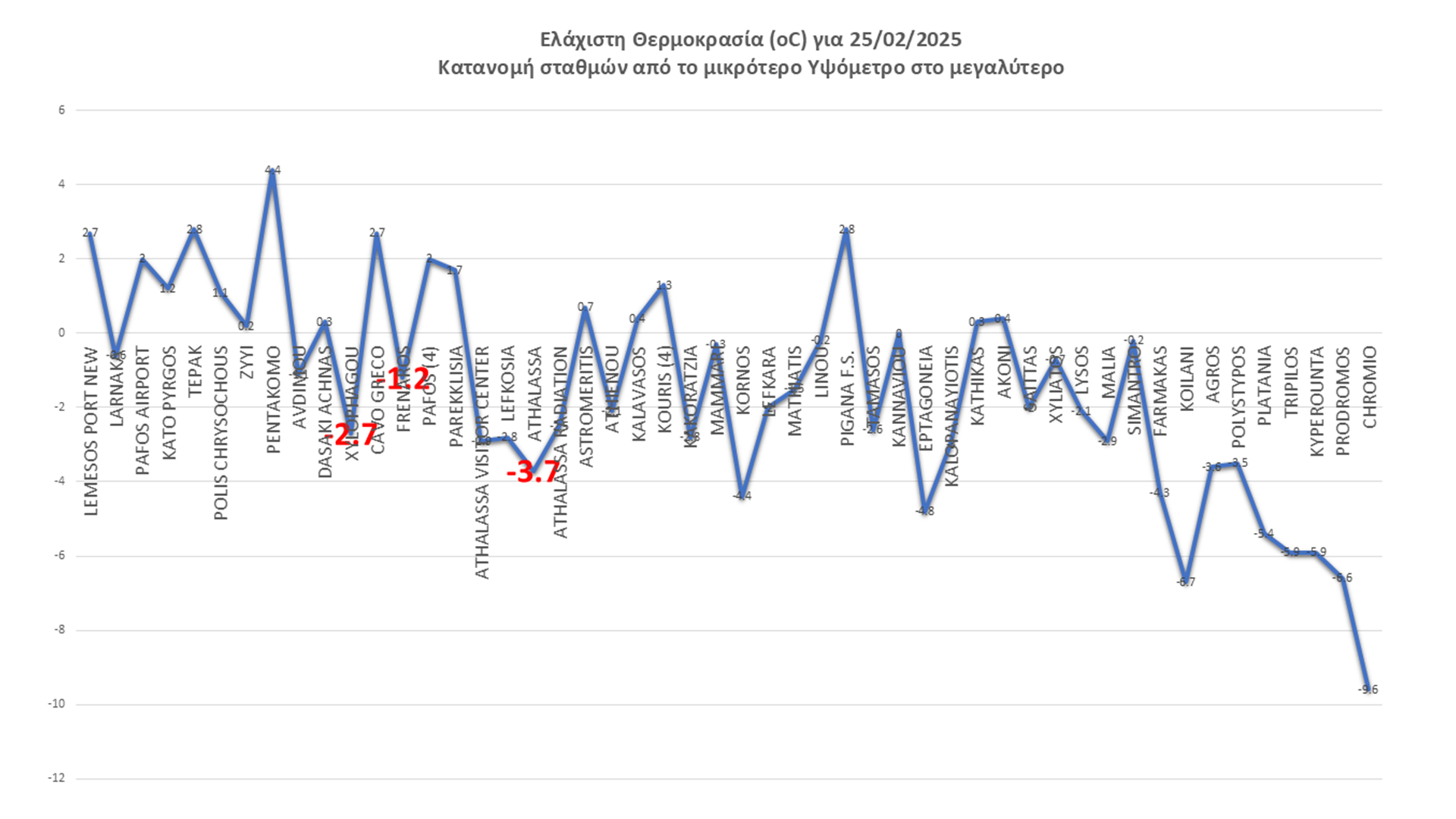 Πιο κάτω, βλέπουμε αναλυτικά την ελάχιστη θερμοκρασία που καταφράφηκε στις 25 Φεβρουαρίου στους σταθμούς του Τμήματος Μετεωρολογίας, από το μικρότερο υψόμετρο στο μεγαλύτερο. Σύμφωνα με τον κ. Τύμβιο, έχουμε τρία νέα ρεκόρ χαμηλών θερμοκρασιών, στους σταθμούς Ξυλοφάγου, Φρέναρος και Αθαλάσσας.