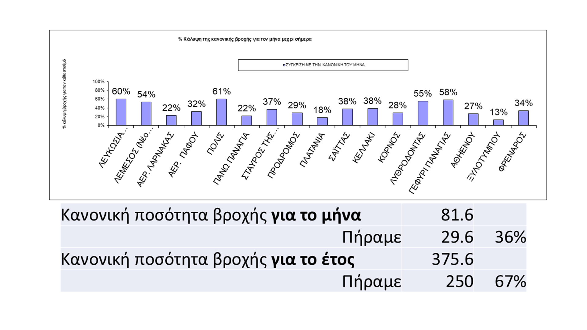 Πιο κάτω, βλέπουμε αναλυτικά την κανονική ποσότητα βροχής τόσο για το μήνα όσο και για το έτος. Με τον κ. Τύμβιο, να λέει πως δυστυχώς, είμαστε κάτω από το μισό. Το έτος μας φαίνεται ότι συνολικά θα είναι «πάρα πολύ κακό», πρόσθεσε.