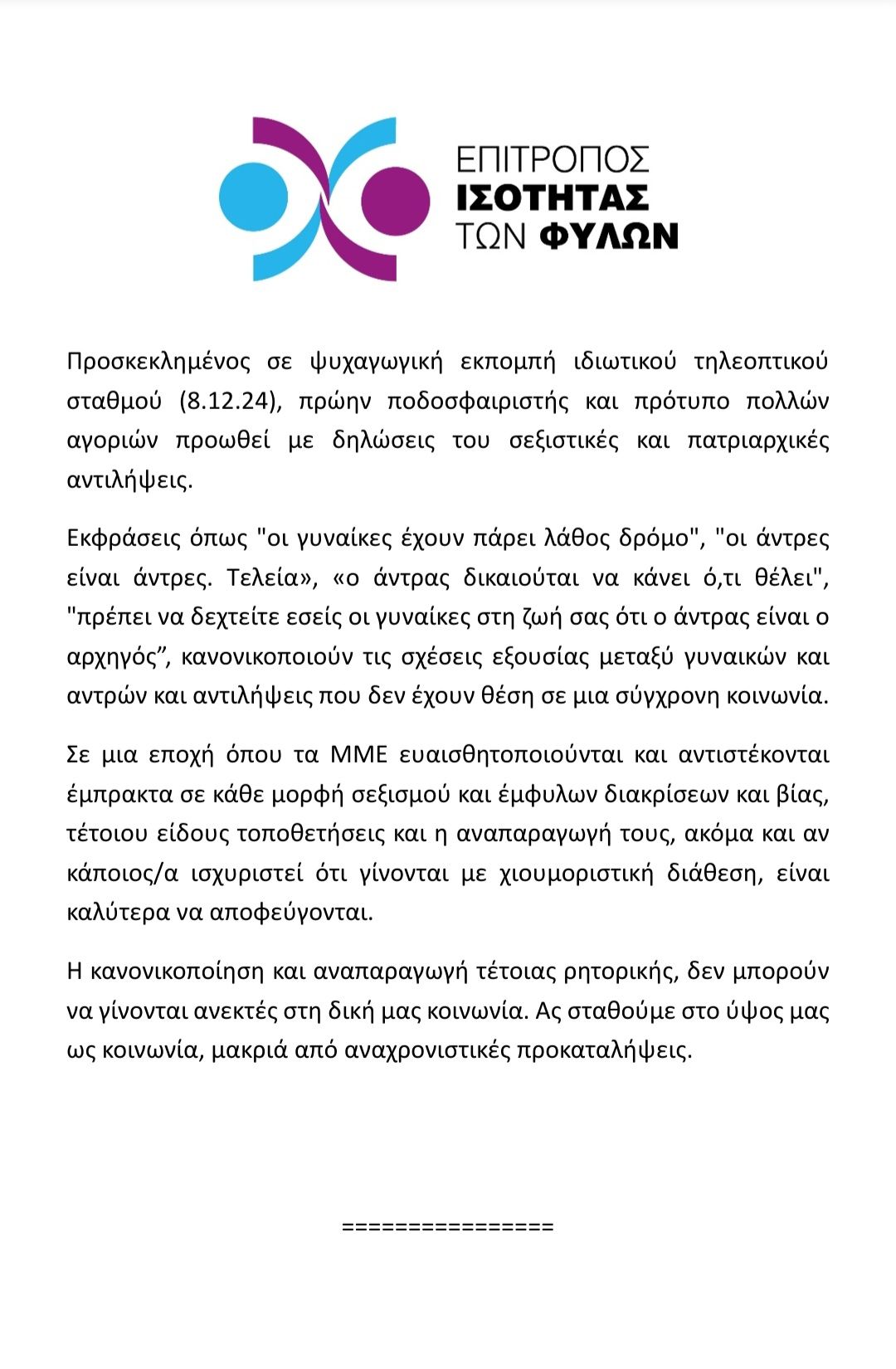 Η Επίτροπος Ισότητας των Φύλων Τζόζη Χριστοδούλου εξέδωσε σχετική ανακοίνωση στην οποία αναφέρει ότι «η κανονικοποίηση σεξιστικής ρητορικής, δεν μπορεί να γίνεται ανεκτή στην κοινωνία μας.»