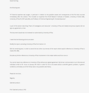 Σε email του προς τον ΕΟΔΑΣΑΑΜ, εκπρόσωπος του πανεπιστημίου της Πίζας παραθέτει ένα κομμάτι της έκθεσης, ξεκαθαρίζοντας ότι το συμπέρασμα αυτό δεν εκδόθηκε ούτε ελέγχθηκε από το πανεπιστήμιο.