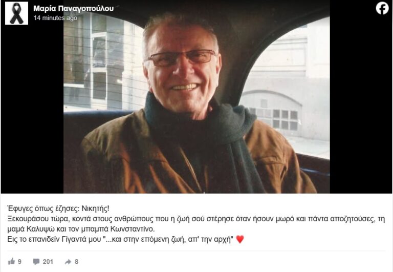 «Έφυγες όπως έζησες: Νικητής! Ξεκουράσου τώρα, κοντά στους ανθρώπους που η ζωή σού στέρησε όταν ήσουν μωρό και πάντα αποζητούσες, τη μαμά Καλυψώ και τον μπαμπά Κωνσταντίνο.Εις το επανιδείν Γίγαντά μου “…και στην επόμενη ζωή, απ’ την αρχή», έγραψε.