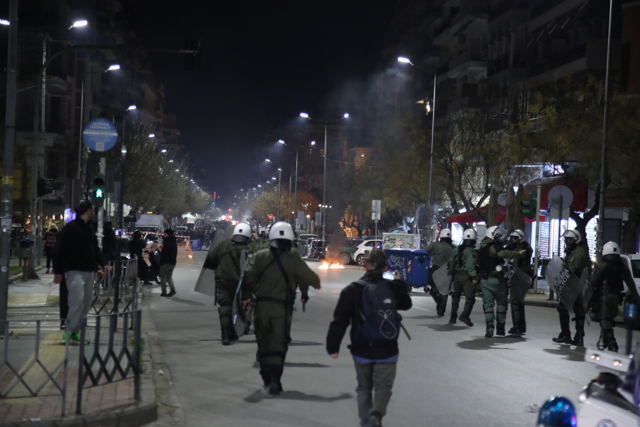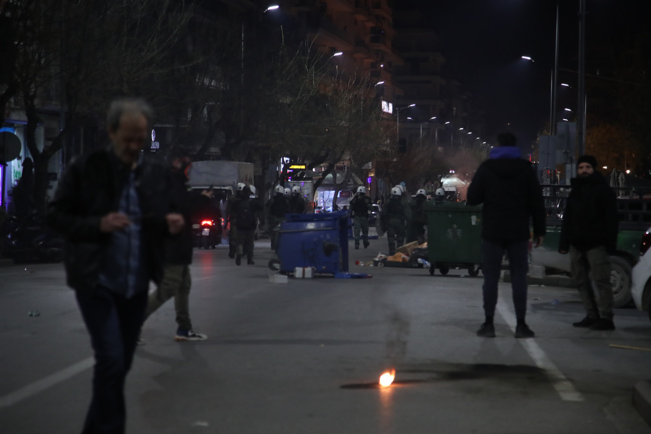 Ένταση μεταξύ δυνάμεων της αστυνομίας και αγνώστων επικράτησε για λίγη ώρα στο κέντρο της Θεσσαλονίκης, μετά από την πορεία για την τραγωδία στα Τέμπη.