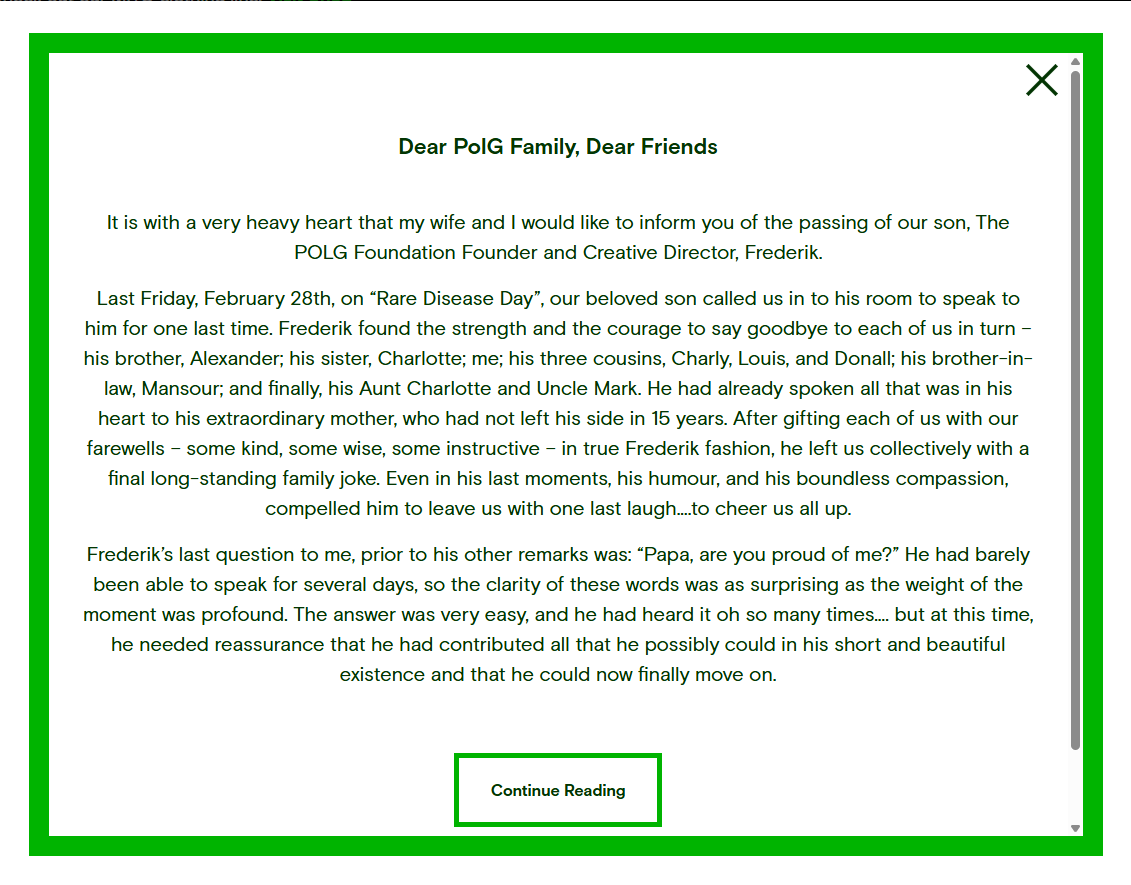 Ο πρίγκιπας Ροβέρτος εξέφρασε τη θλίψη του με ένα εκτενές, συγκινητικό μήνυμα που δημοσιεύτηκε στον ιστότοπο του ιδρύματος POLG – ενός οργανισμού που δημιούργησε ο ίδιος ο Πρίγκιπας Φρέντερικ, αφιερωμένο στην εύρεση αποτελεσματικών θεραπειών και μιας οριστικής θεραπείας για τις μιτοχονδριακές διαταραχές POLG.