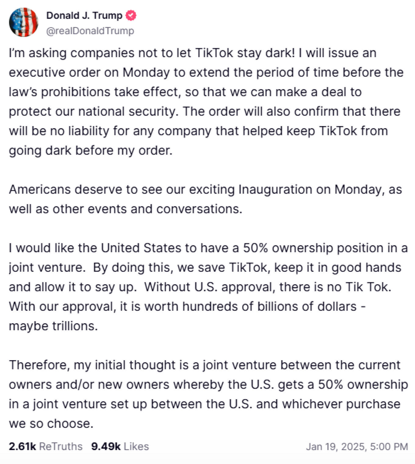 Ο Τραμπ ανέφερε ότι θα ήθελε οι ΗΠΑ να κατέχουν το 50% του TikTok για να προστατεύσουν την πλατφόρμα. «Χωρίς την έγκριση των ΗΠΑ, δεν υπάρχει TikTok», έγραψε. «Η αρχική μου σκέψη είναι μια κοινοπραξία μεταξύ των σημερινών ιδιοκτητών ή/και νέων ιδιοκτητών, με την οποία οι ΗΠΑ αποκτούν 50% ιδιοκτησία», ανέφερε.