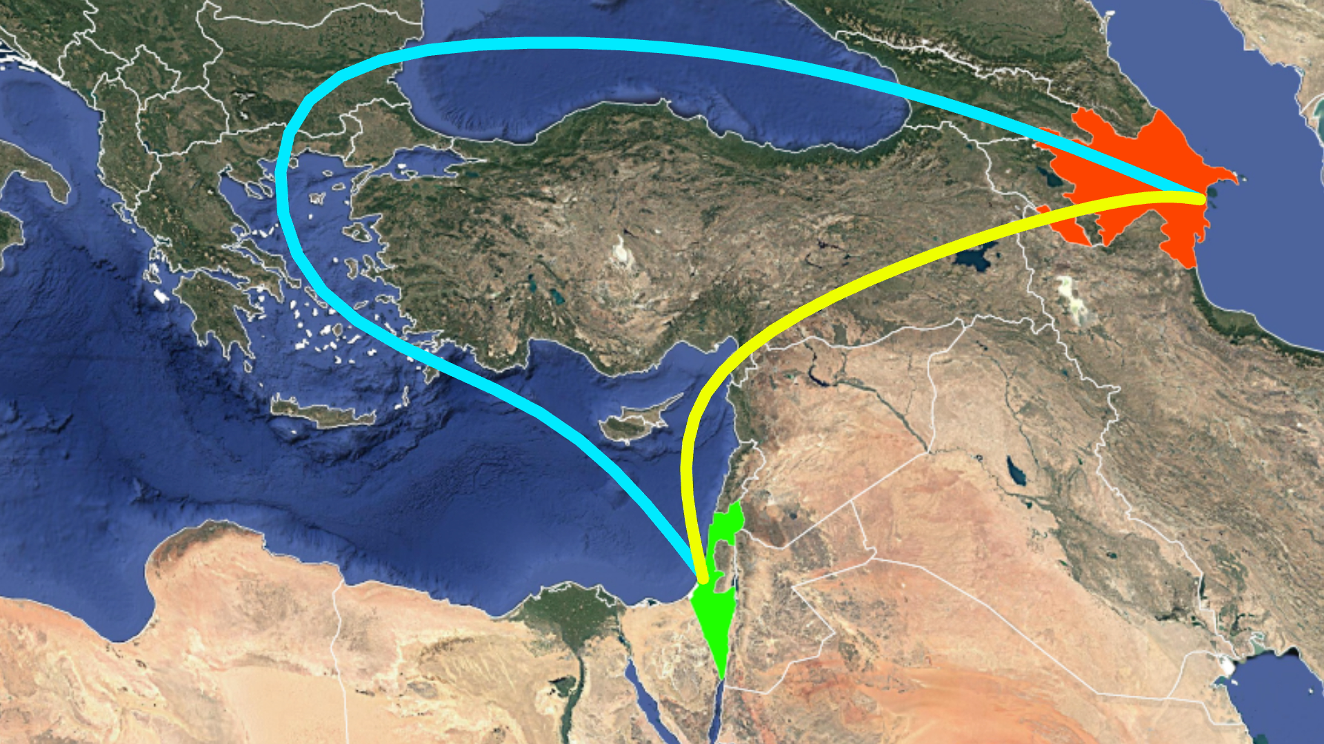 Τον γύρο της Ανατολικής Μεσογείου έκανε το ισραηλινό αεροσκάφος μέχρι να προσγειωθεί στο Αζερμπαϊτζάν (μπλε γραμμή)