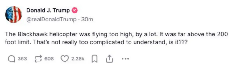 «Το ελικόπτερο Blackhawk πετούσε πολύ πιο ψηλά από το επιτρεπτό όριο. Ήταν αρκετά πάνω από το όριο των 200 ποδιών. Αυτό δεν είναι και τόσο δύσκολο να καταλάβει κανείς, σωστά;» έγραψε χαρακτηριστικά ο πρόεδρος των ΗΠΑ.
