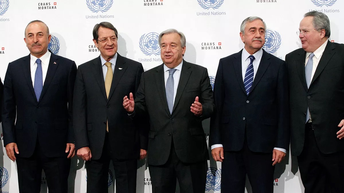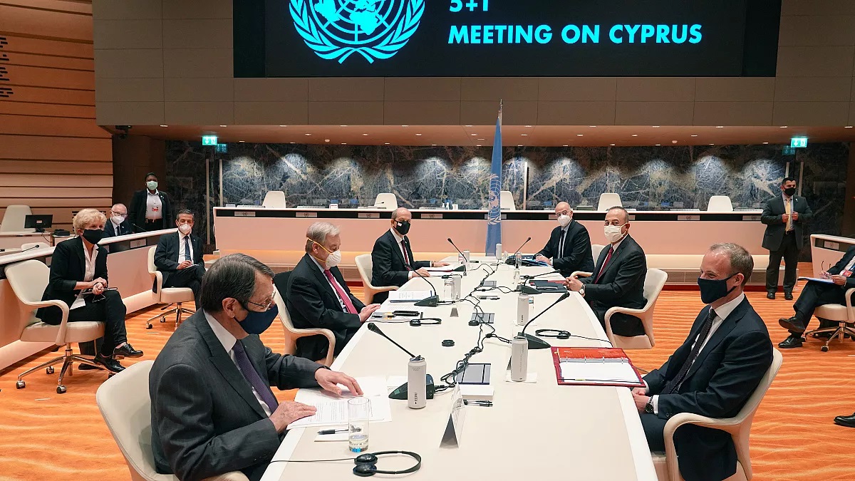 Το ημερολόγιο δείχνει 28 Απριλίου 2021. Ο Αντόνιο Γκουτέρες υποδέχεται στο Παλάτι των Εθνών τους δυο ηγέτες, Νίκο Αναστασιάδη και Ερσίν Τατάρ, και τους τρεις Υπουργούς Εξωτερικών των εγγυητριών δυνάμεων (Νίκο Δένδια, Μεβλούτ Τσαβούσογλου και Ντομινίκ Ράμπ).