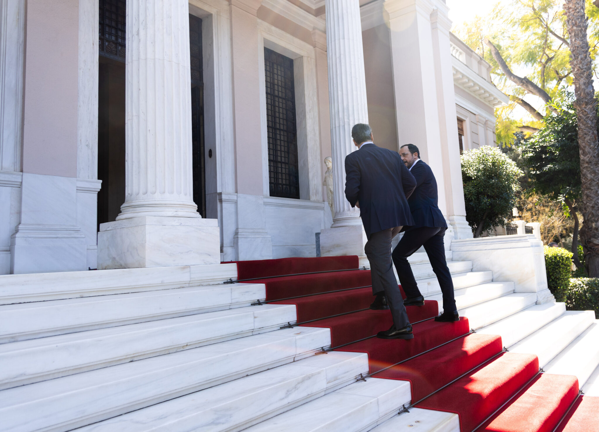Μετά την κατ’ ιδίαν συνάντηση που είχαν ο Πρόεδρος της Δημοκρατίας με τον Πρωθυπουργό της Ελλάδας, ακολούθησε διευρυμένη συνάντηση στην παρουσία των αντιπροσωπιών. Τον Πρόεδρο της Δημοκρατίας συνοδεύουν ο Υπουργός Εξωτερικών δρ Κωνσταντίνος Κόμπος, ο Κυβερνητικός Εκπρόσωπος κ. Κωνσταντίνος Λετυμπιώτης, η Υφυπουργός για Ευρωπαϊκά Θέματα κα Μαριλένα Ραουνά, ο Ελληνοκύπριος Διαπραγματευτής κ. Μενέλαος Μενελάου και άλλοι υπηρεσιακοί παράγοντες.