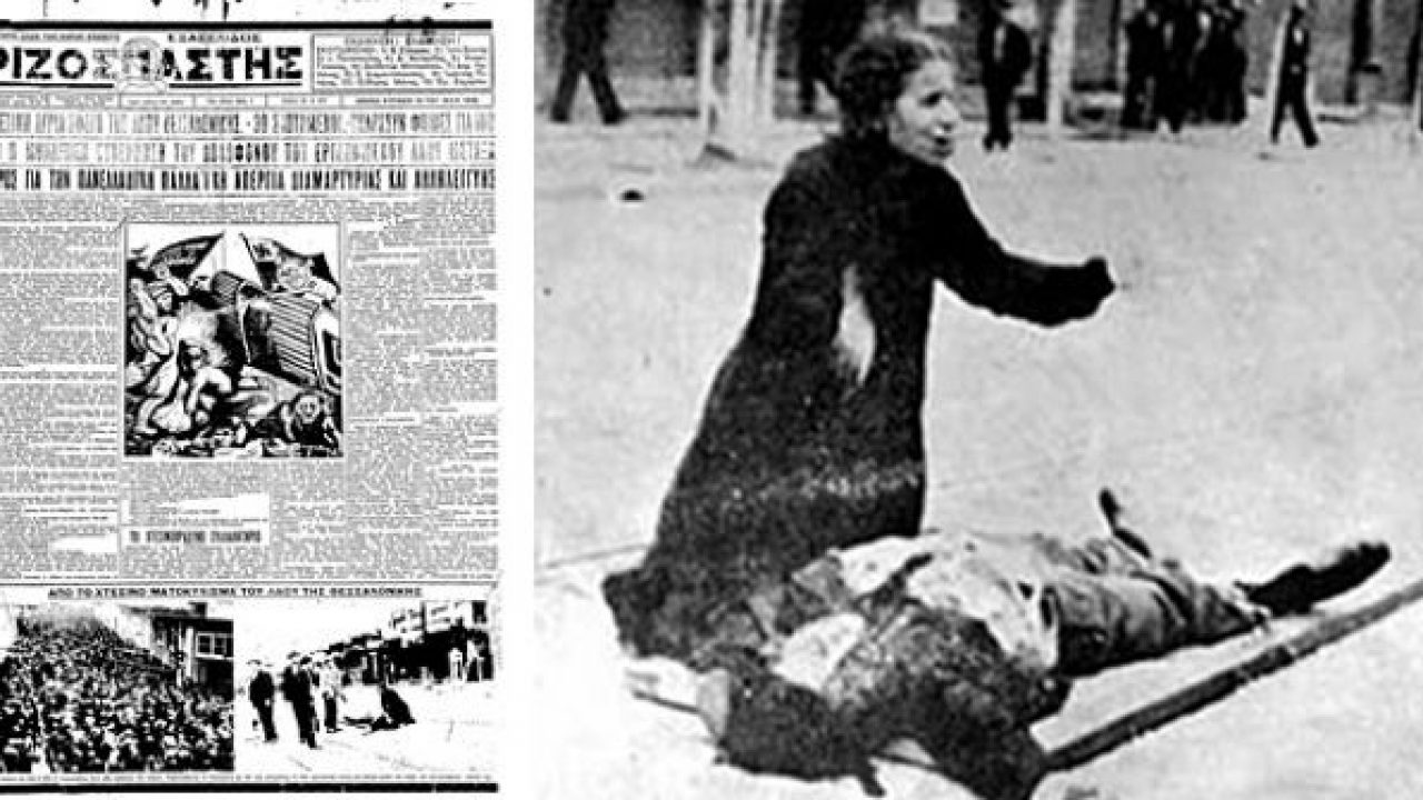 Θεσσαλονίκη. Μάης του 1936. Μια μάνα καταμεσής του δρόμου μοιρολογάει το σκοτωμένο παιδί της.