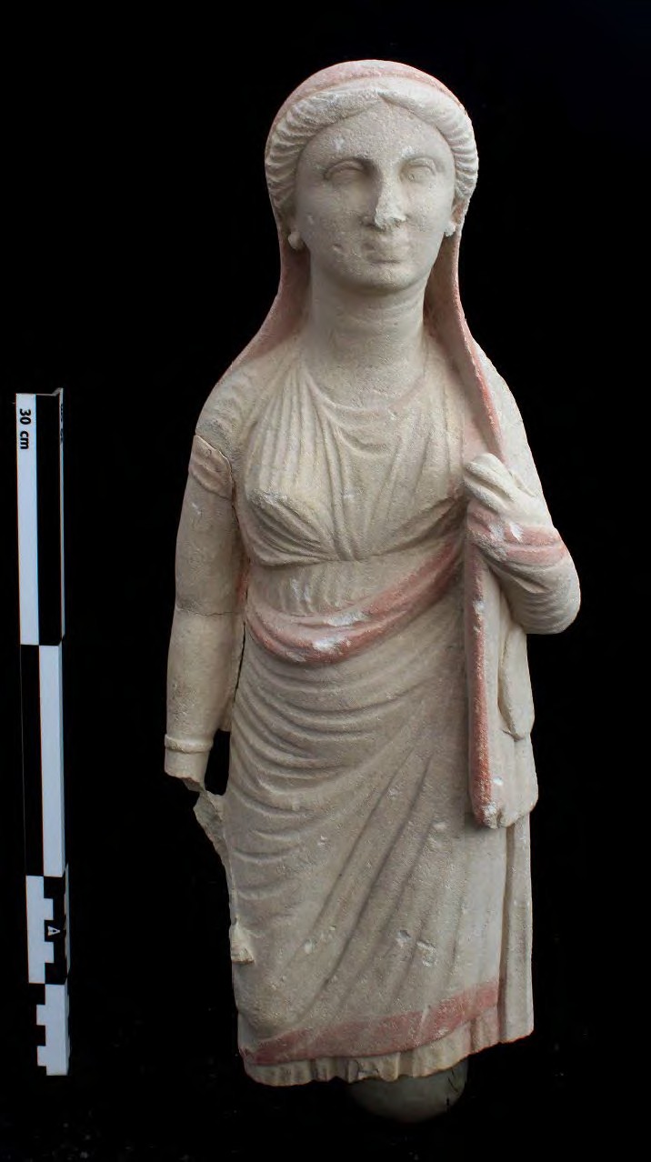 Στα τελευταία δωμάτια στη ΒΑ γωνία του κτιρίου 1, ανακαλύφθηκαν πολλά ειδώλια από ασβεστόλιθο και τερακότα, όλα πολύ καλής κατασκευής, τοποθετημένα και ευθυγραμμισμένα κατά μήκος του τοίχου του τεμένους. Ενδιαφέρον παρουσιάζει το γεγονός ότι σε μια συγκεκριμένη στιγμή, που – σύμφωνα με τα αποτελέσματα των προηγούμενων ετών – μπορούμε να χρονολογήσουμε γύρω στο 500 π.Χ., δημιουργήθηκε ένα νέο επίπεδο δαπέδου στο χώρο αυτό, ενσωματώνοντας πλήρη ασβεστολιθικά αγαλματίδια της κυπροαρχαϊκής περιόδου, πακτωμένα σε ένα σκληρό στρώμα κονιάματος. Ενώ σε άλλες περιοχές της ανασκαφής τα αντίστοιχα στρώματα δαπέδου περιείχαν μικρά θραύσματα βαριά σπασμένων αρχαϊκών γλυπτών, στη συγκεκριμένη ζώνη που ανασκάφηκε φέτος, βρέθηκαν αρκετά πλήρη ή σχεδόν πλήρη αγαλματίδια στο στρώμα δαπέδου, σαν να είχαν εναποτεθεί σκόπιμα. Σε έναν επόμενο ορίζοντα καταστροφής, περίπου 10 εκατοστά πάνω από το στρώμα δαπέδου που περιείχε αποκλειστικά κυπροαρχαϊκά γλυπτά, βρέθηκαν και πάλι (σχεδόν) πλήρη αγαλματίδια από τερακότα και ασβεστόλιθο, αλλά εδώ υπήρχαν γλυπτά από την κυπροαρχαϊκή έως την ελληνιστική περίοδο. Ένα από τα πιο αξιοσημείωτα αντικείμενα από αυτόν τον ορίζοντα είναι ένα ασβεστολιθικό αγαλματίδιο με σωζόμενο ύψος 40 εκατοστών. Απεικονίζει μια γυναίκα που φοράει χιτώνα και ιμάτιο με έντονα κόκκινα χρώματα στα αντίστοιχα άκρα του. Το ιμάτιο καλύπτει επίσης το πίσω μέρος του κεφαλιού, αφήνοντας ορατούς τους μπροστινούς βοστρύχους των μαλλιών και τα αυτιά με τα ενώτια. Το αριστερό χέρι είναι λυγισμένο προς το αριστερό στήθος και με τα δάκτυλα να κρατούν το ιμάτιο και ένα οβάλ αντικείμενο, πιθανώς ένα αυγό. Στον αριστερό της πήχη κρέμεται ή βαστάζει ένα επίπεδο, στρογγυλό αντικείμενο, ίσως ένας καθρέφτης. Το δεξί της χέρι κρέμεται στο δεξιό πλευρό του σώματος και ενώ αρχικά κρατούσε ένα αντικείμενο πλέον έχει χαθεί, αν και τα υπολείμματα του είναι ορατά στο δεξιό μηρό της, λίγο πάνω από το γόνατο. Ο δεξιός καρπός της κοσμείται από ένα βραχιόλι. Ως προς τη γενική στάση και το περίγραμμα, το αγαλματίδιο παρουσιάζει ομοιότητες με ένα ελληνιστικό άγαλμα φυσικού μεγέθους που βρέθηκε στο ίδιο σημείο τον 19ο αιώνα και σήμερα φυλάσσεται στο Μουσείο του Λούβρου στο Παρίσι (inv. N III 3278). Όπως και το άγαλμα στο Λούβρου, το μικρότερο αυτό ασβεστολιθικό αγαλματίδιο θα πρέπει να χρονολογείται στην ελληνιστική περίοδο και να αντιπροσωπεύει είτε την ίδια τη θεά Αφροδίτη είτε μια λατρεύτρια.