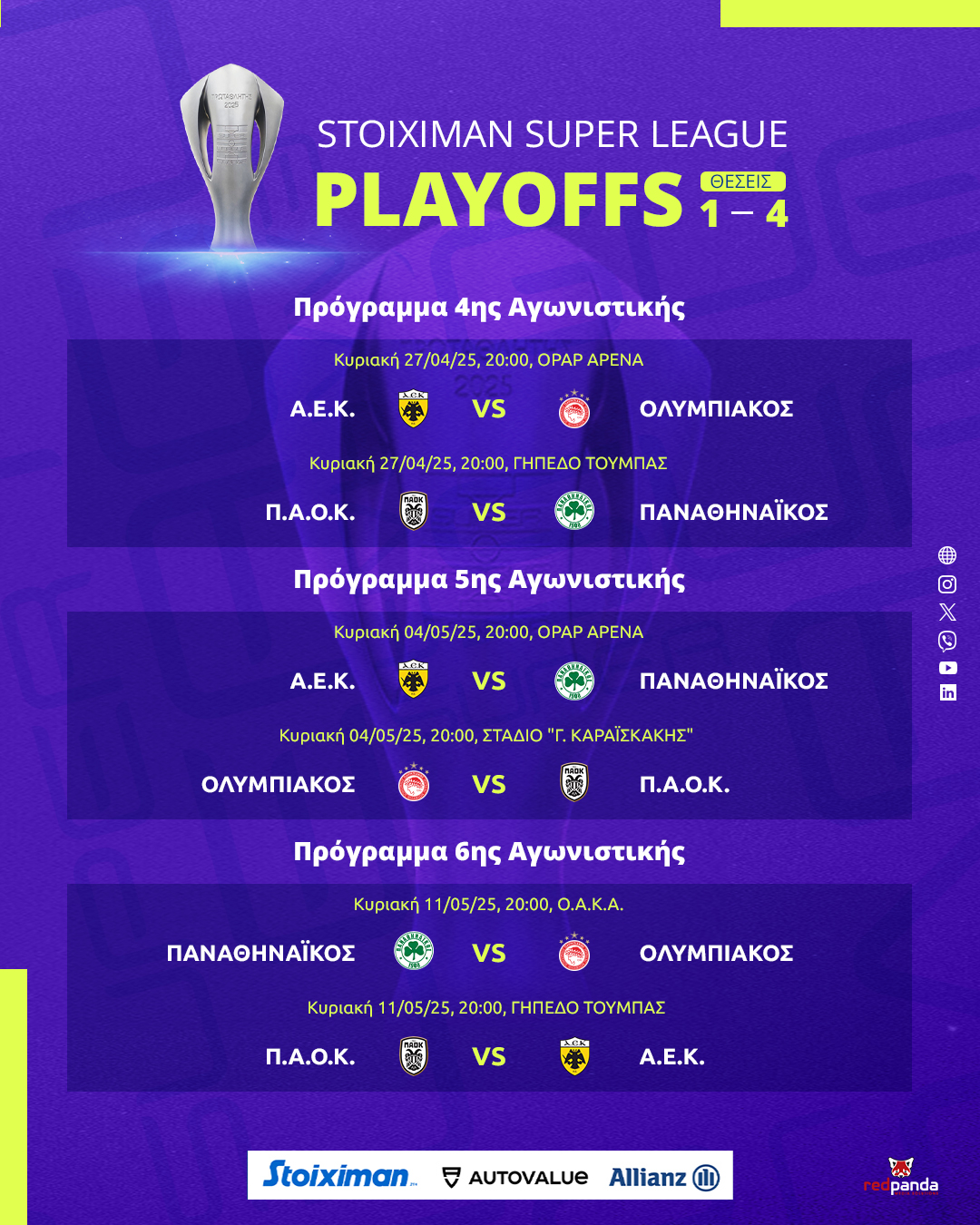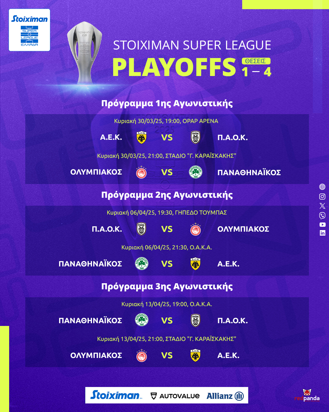 Η Stoiximan Super League ανακοίνωσε το πλήρες πρόγραμμα των playoffs για τις θέσεις 1-4.