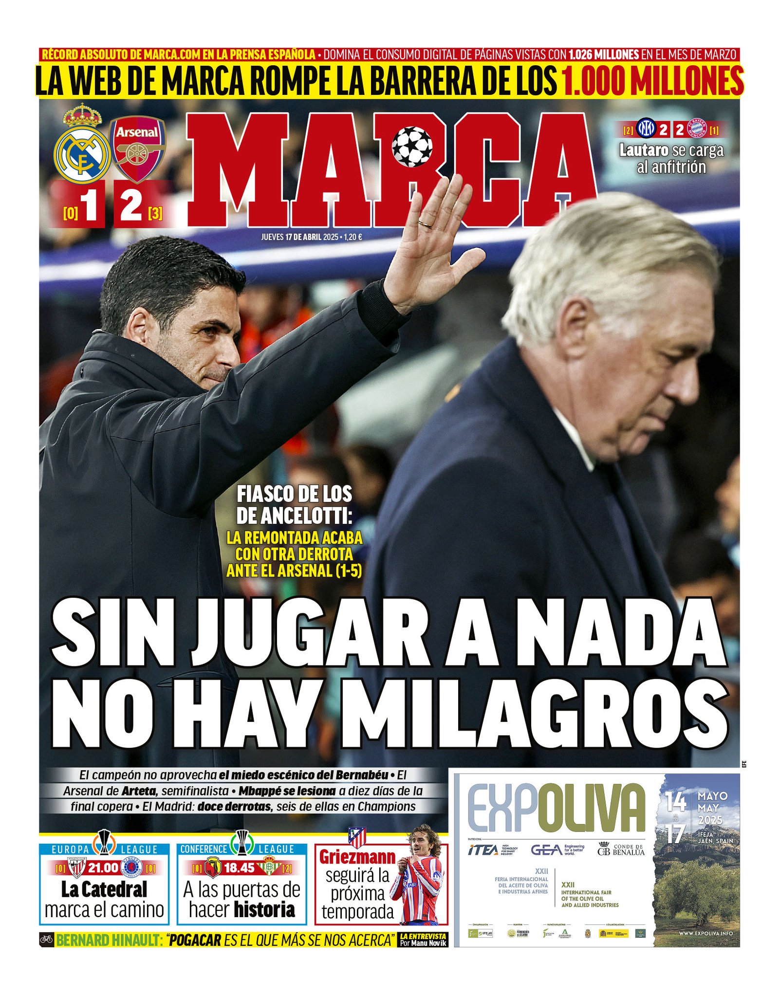 Μάλιστα το πρωτοσέλιδο της ισπανικής εφημερίδας η οποία είναι και φιλικά προσκείμενη προς τη Ρεάλ Μαδρίτης, αναφέρει ότι: «Φιάσκο! Δε μπορείς ελπίζεις σε θαύματα αν δεν παίζεις… τίποτα».
