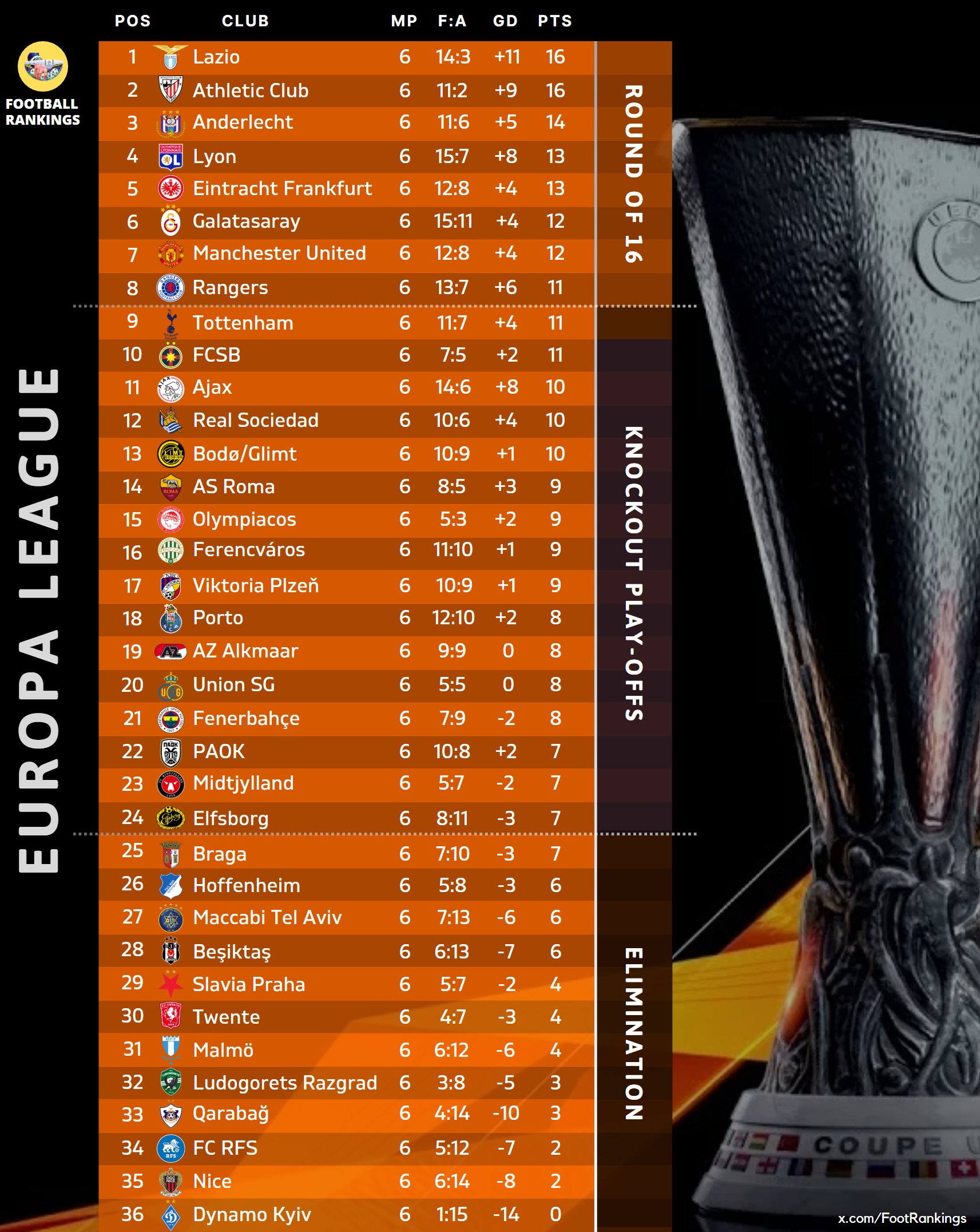Το εισιτήριο πήρε και η Λιόν, που νίκησε 3-2 την Άιντραχτ Φρανκφούρτης σε ένα συναρπαστικό ματς, με αμφότερες ομάδες να είναι επίσης σίγουρα στην επόμενη φάση. Στη Γλασκώβη, το μεγάλο ματς ανάμεσα σε Ρέιντζερς και Τότεναμ έληξε ισόπαλο, 1-1, ενώ η Πόρτο λύγισε με 2-0 τη Μίντιλαντ και μπήκε στην 24άδα.