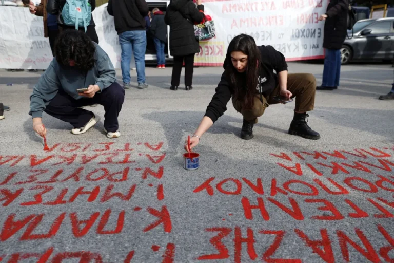 Έξω από το δικαστήριο ήταν συγκεντρωμένος κόσμος, με πανό και συνθήματα, που μάλιστα έγραψε στο χώρο τα ονόματα των θυμάτων του δυστυχήματος.