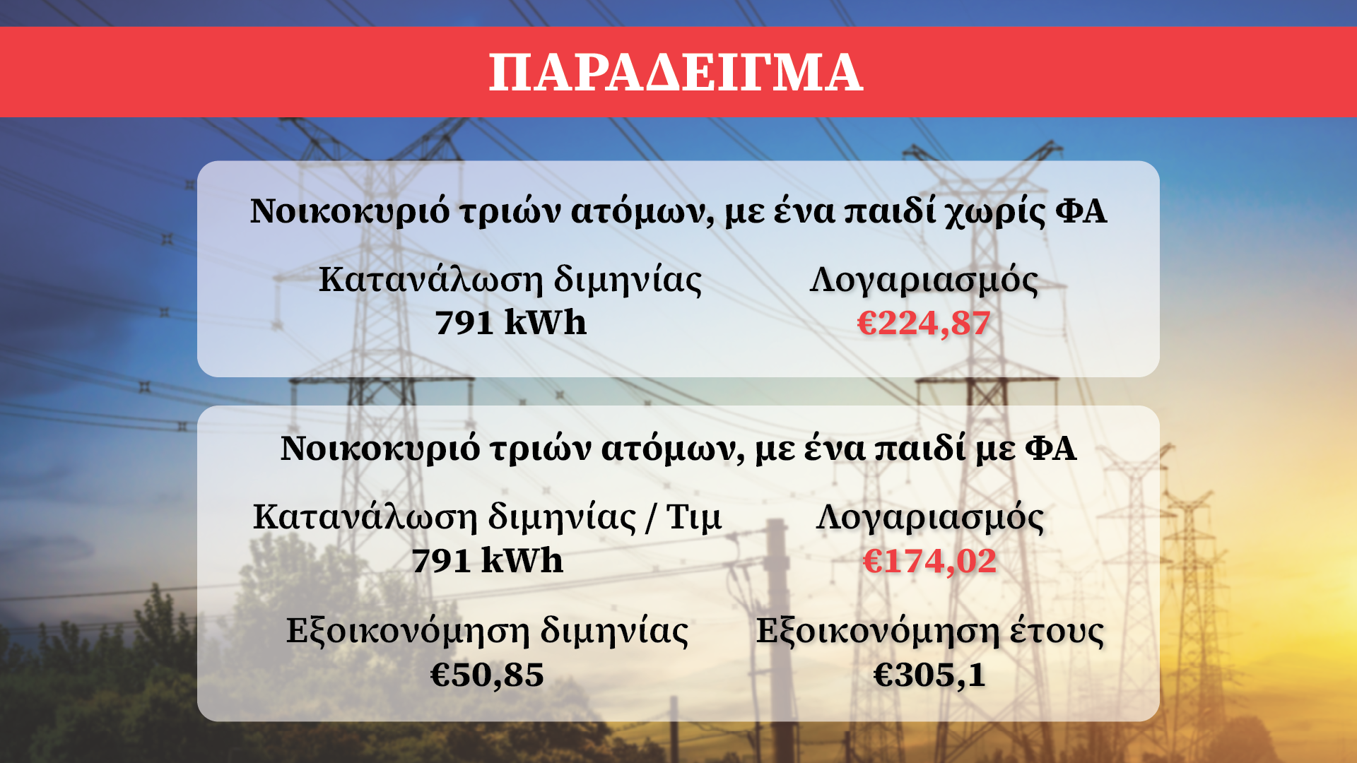 Στην περίπτωση ενός ενδεικτικού νοικοκυριού τριών ατόμων, δηλαδή δύο ενηλίκων και ενός ανήλικου παιδιού, με κατανάλωση διμήνου 791 kWh και λογαριασμό ηλεκτρικού ρεύματος ύψους €224,87, το αισιόδοξο σενάριο μείωσης της τιμής κατά 22% θα περιόριζε τον λογαριασμό στα €174,02. Πρόκειται για μείωση €50,85 ανά δίμηνο ή €305,10 σε ετήσια βάση.
