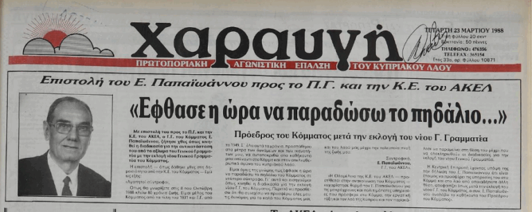 Λίγο πριν τον θάνατο του, ο επί 39 χρόνια ηγέτης του ΑΚΕΛ Εζεκίας Παπαϊωάννου, στις 10 Απριλίου 1988, πρόλαβε να δείξει στα μέλη της κεντρικής επιτροπής του κόμματος, στον νεαρό τότε Δημήτρη Χριστόφια ως το πρόσωπο που θα ήθελε να τον διαδεχτεί.