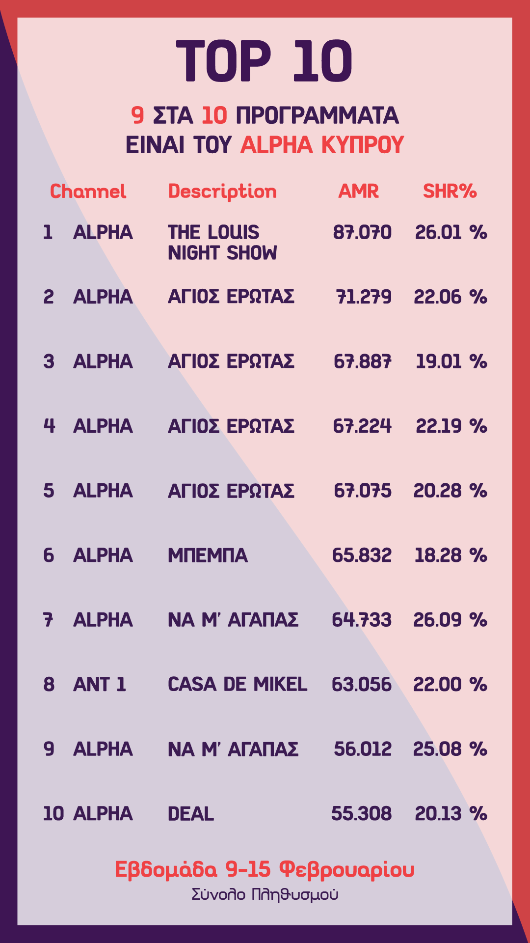 Η επιτυχία της prime time ζώνης και της μυθοπλασίας διαφαίνεται και στα κορυφαία προγράμματα της εβδομάδας. Για την προηγούμενη εβδομάδα, το top 10 της κυπριακής τηλεόρασης κατακτήθηκε από τον Alpha Κύπρου, αφού και τα 9 πιο επιτυχημένα προγράμματα ανήκουν στο κανάλι. O «Άγιος Έρωτας» συνεχίζει και καθηλώνει το κοινό με τις καταιγιστικές του εξελίξεις ενώ η σάτιρα έχει ξεκάθαρα πρόσωπο και είναι του… Λούη Πατσαλίδη με το «Λούης Night Show», ο οποίος είναι μονίμως στην κορύφη, με ποσοστό πάνω από 26%. Άραγε νιώθει μοναξιά τόσα χρόνια;