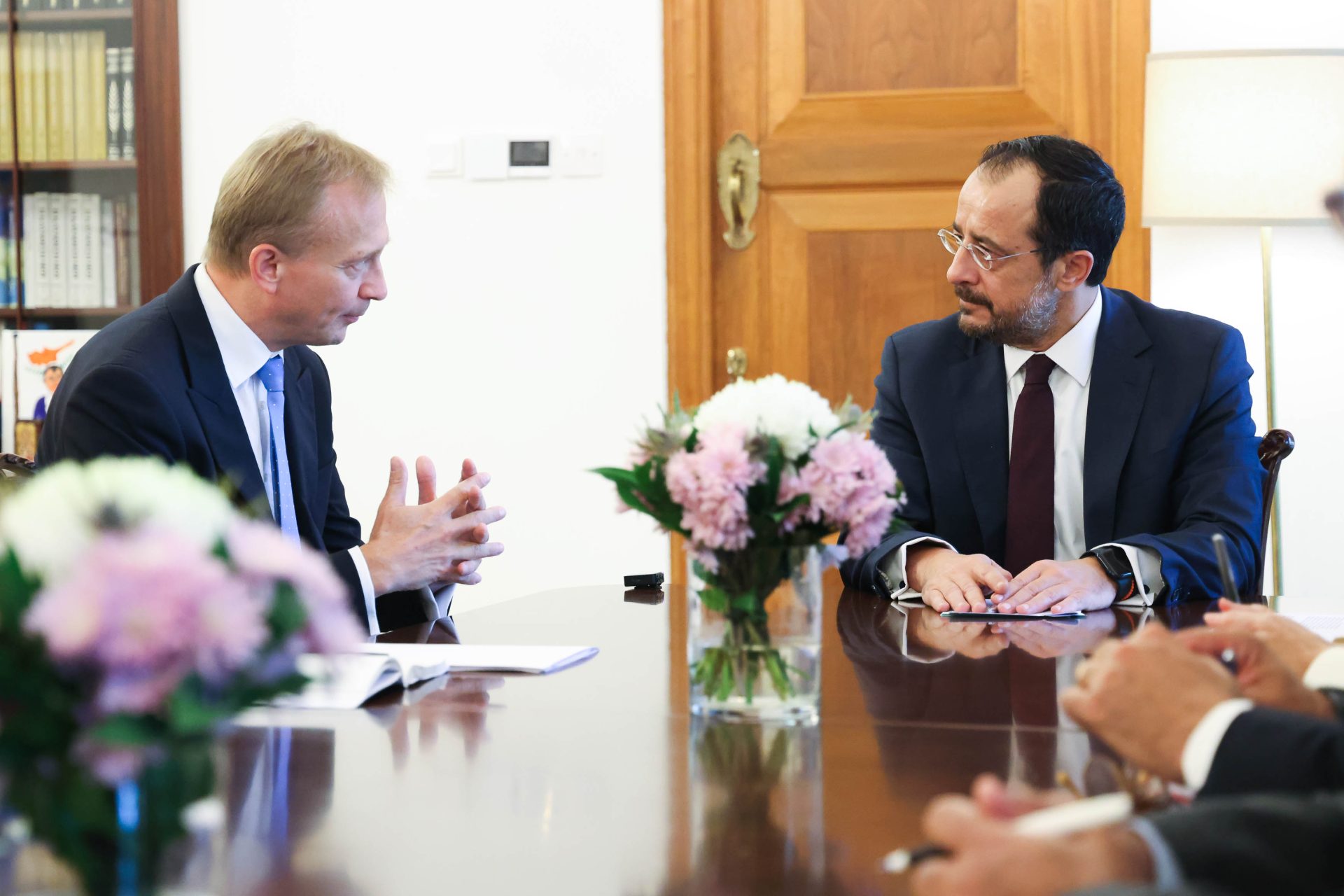 Ο Πρόεδρος της Δημοκρατίας κ. Νίκος Χριστοδουλίδης δέχθηκε σήμερα, στο Προεδρικό Μέγαρο, τον Επίτροπο της ΕΕ, αρμόδιο για τον Προϋπολογισμό, την Καταπολέμηση της Απάτης και τη Δημόσια Διοίκηση κ. Πιότρ Σεραφίν, στην παρουσία της Υφυπουργού για Ευρωπαϊκά Θεματα κας Μαριλένας Ραουνά.