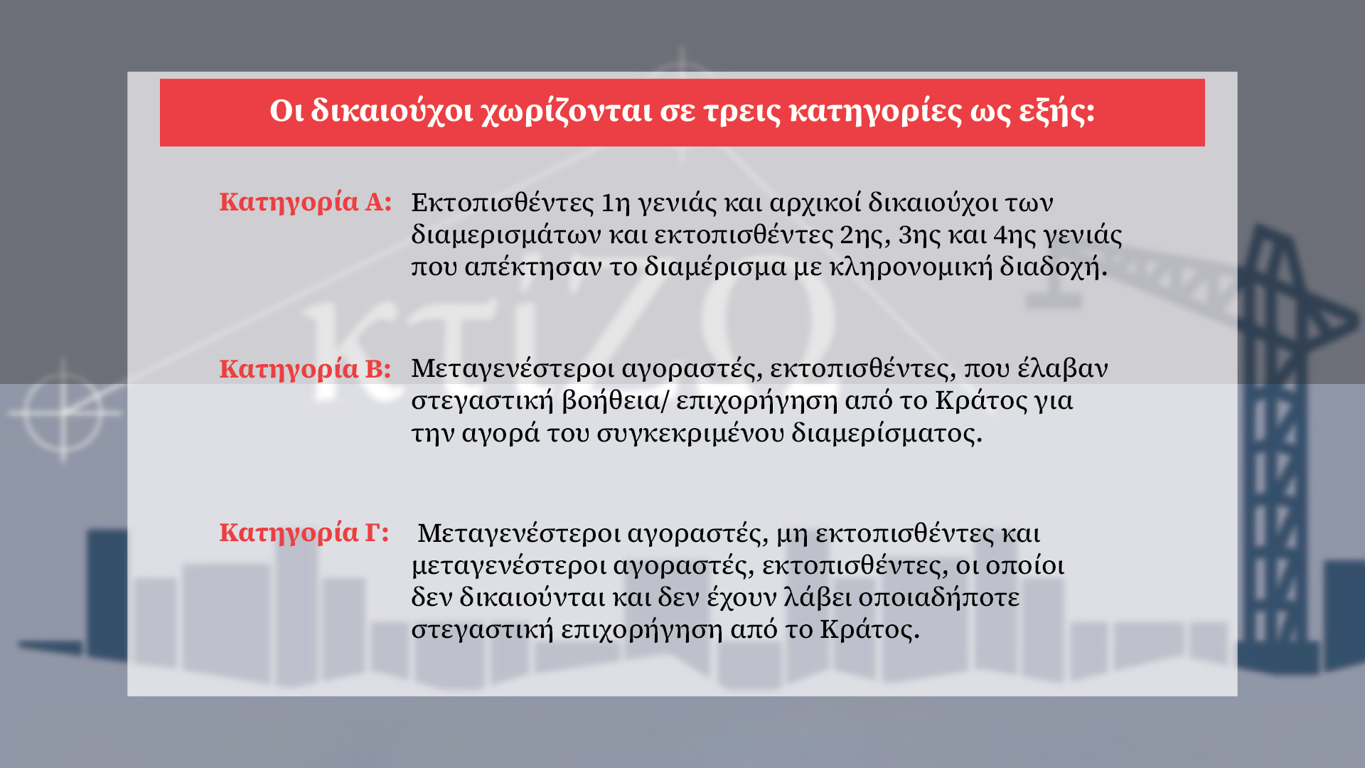 Δικαιούχοι του ΚτίΖΩ είναι πρόσφυγες που διαμένουν σε πολυκατοικίες οι οποίες έχουν χαρακτηριστεί ακατάλληλες ή επικίνδυνες και έχουν ενταχθεί στις φάσεις υλοποίησης του σχεδίου. Προτεραιότητα δίνεται σε ευάλωτες ομάδες, όπως ηλικιωμένοι, άτομα με αναπηρία, χαμηλοσυνταξιούχοι και μονογονεϊκές οικογένειες.
