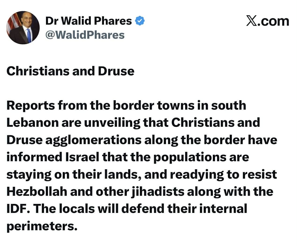 Ωστόσο, δεν πρέπει να διαφεύγει μία σημαντική λεπτομέρεια. Σήμερα υπάρχουν στον Νότιο Λίβανο χωριά που δεν έχουν εκκενωθεί. Είναι τα χωριά των Χριστιανών και των Δρούζων, που δείχνουν συμφιλιωμένα με την νέα πραγματικότητα επί του πεδίου. Εντύπωση προκαλεί ανάρτηση στην πλατφόρμα Χ του, λιβανικής καταγωγής, Ουαλίντ Φάρες, ο οποίος είχε διατελέσει ειδικός σύμβουλος του Λευκού Οίκου για ζητήματα Λιβάνου κατά την πρώτη προεδρική θητεία του Ντόναλντ Τραμπ. Την περασμένη Πέμπτη (2/4), ο Φάρες επικαλέσθηκε «τοπικούς παράγοντες χριστιανικών και δρουζικών χωριών που βρίσκονται στην μεθόριο Λιβάνου-Ισραήλ» που φέρονται να ενημέρωσαν τον IDFότι θα παραμείνουν στις εστίες τους «για να προστατεύσουν τα χωριά τους» από πιθανές επιθέσεις ενόπλων Σιιτών της Χεζμπολάχ.