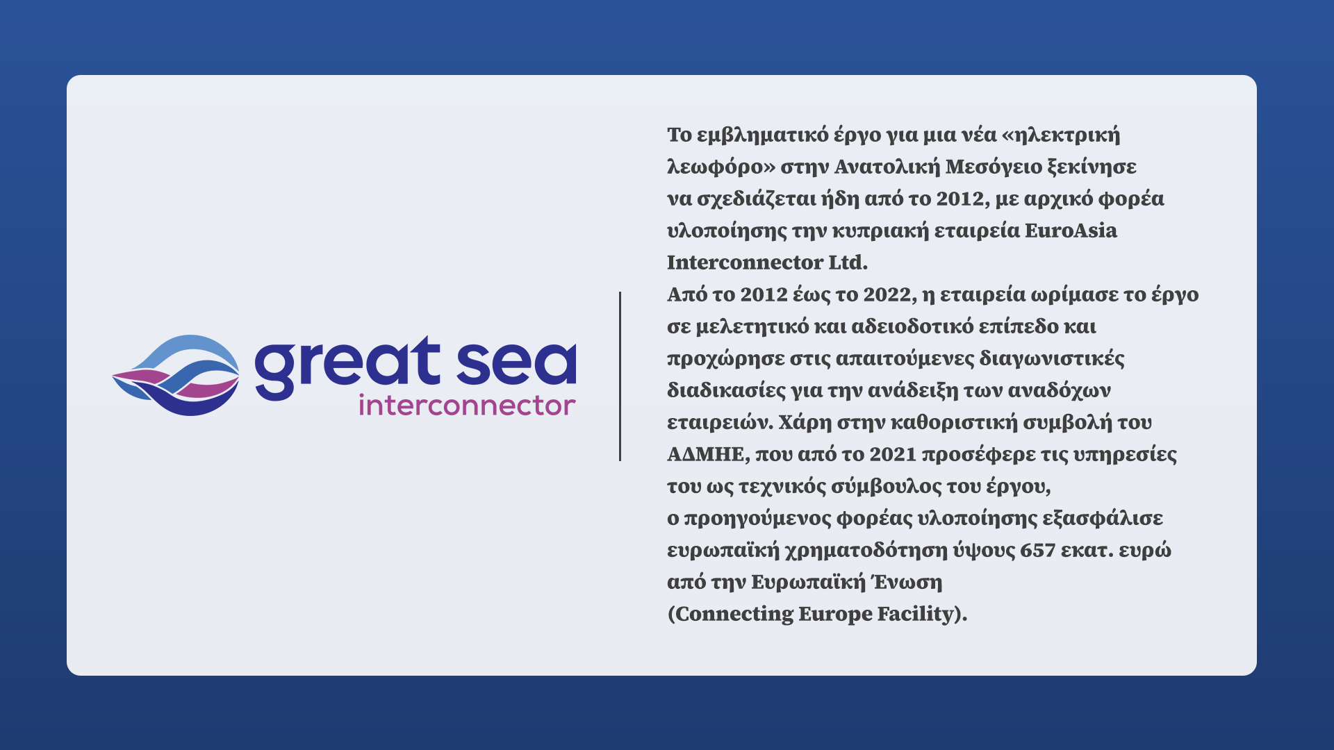 Χρονολογία που ο ΑΔΜΗΕ, συμβάλει στον Great Sea Interconnector και όπως αναφέρεται στην επίσημη σελίδα του GSI, η συμβολή του ΑΔΜΗΕ το 2021, ήταν καθοριστική.