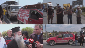 Κτηνοτρόφοι απέκλεισαν τον κυκλικό κόμβο της Ριζοελιάς με οχήματα, τρακτέρ και φέρετρο διαμαρτυρόμενοι για τη θανάτωση υγιών ζώων στο πλαίσιο της αντιμετώπισης του αφθώδους πυρετού