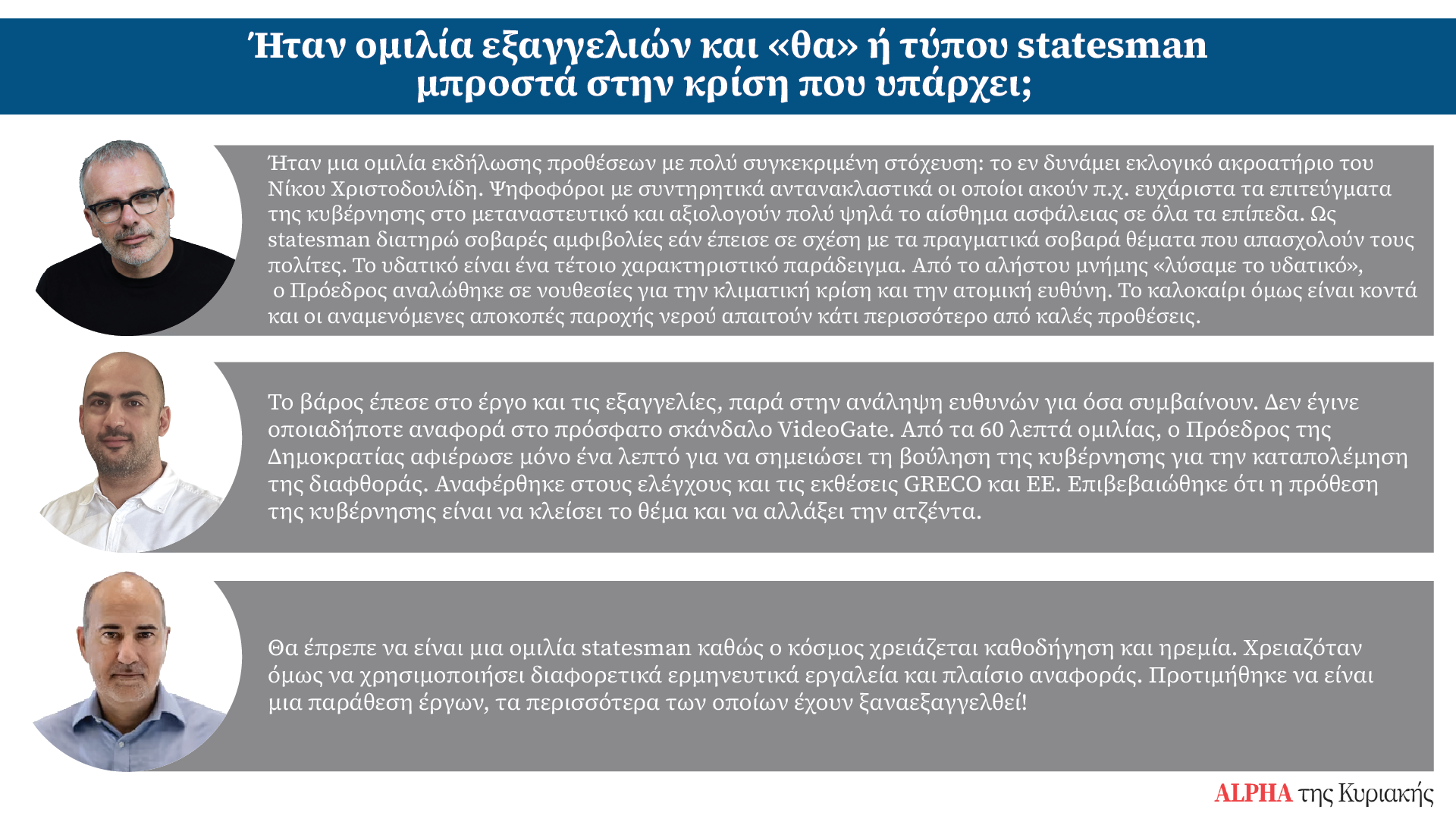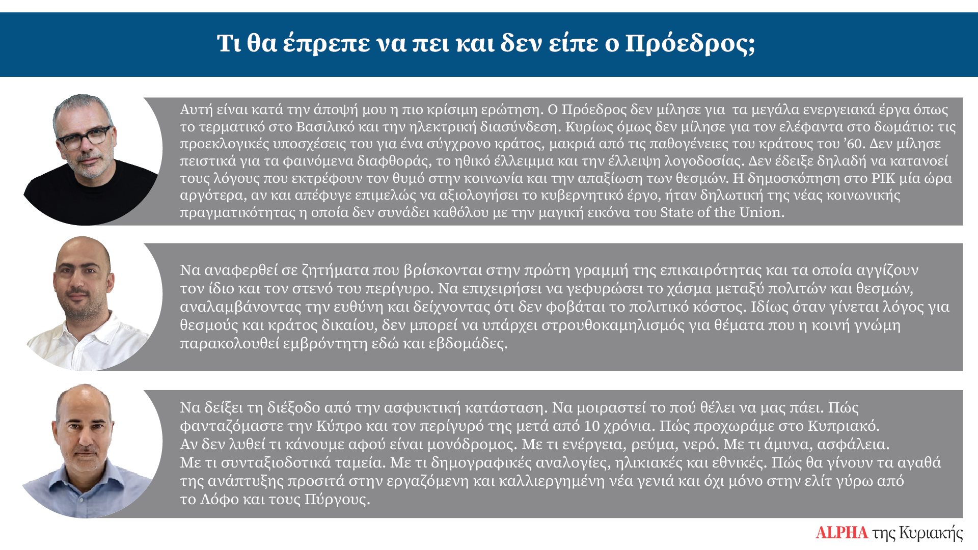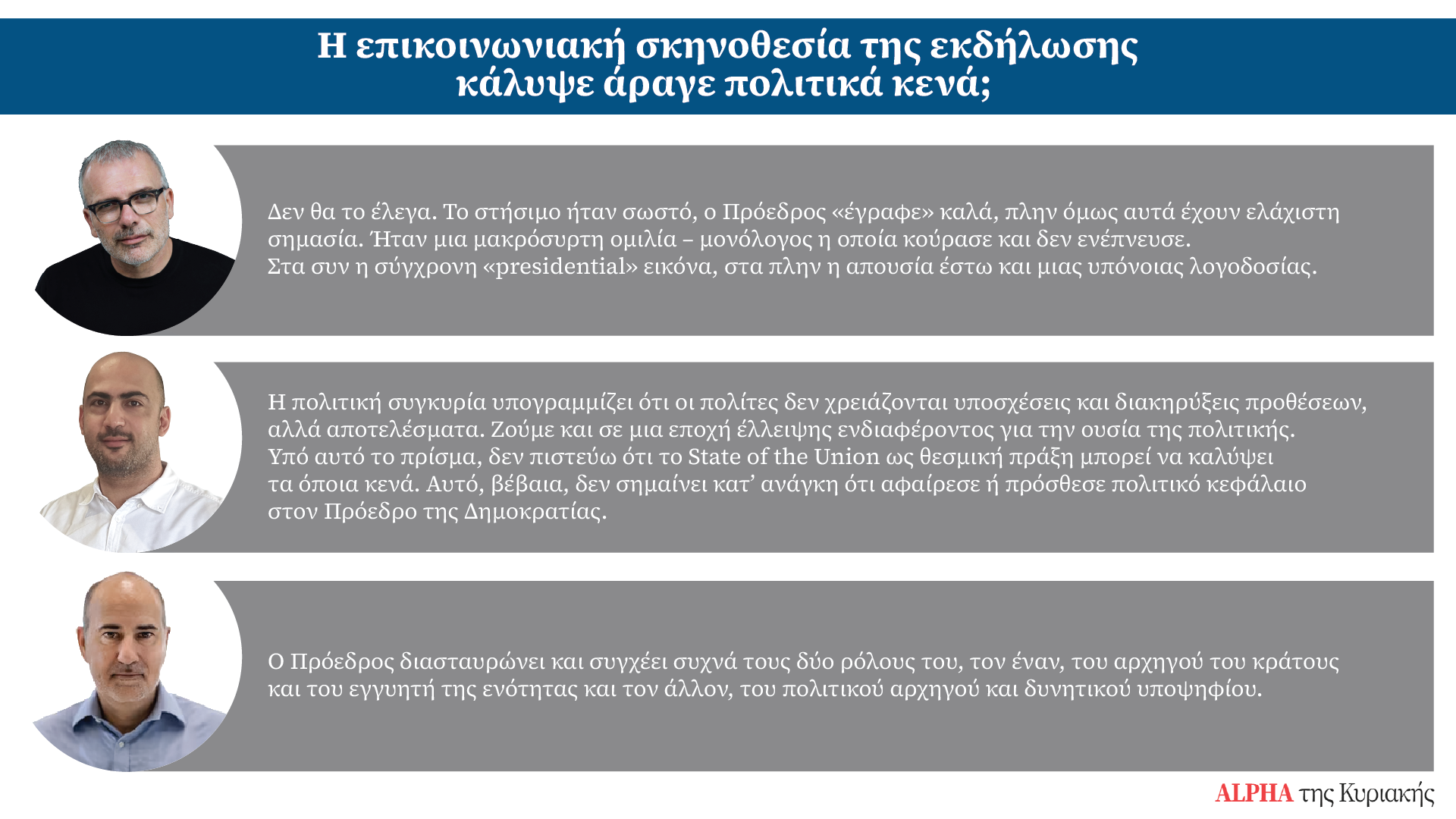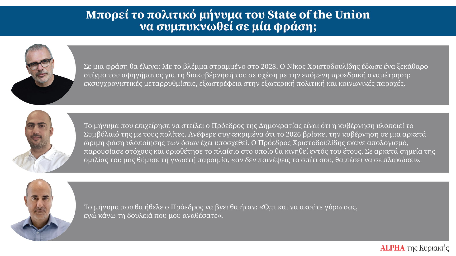 Μπορεί ο Πρόεδρος να ήλπιζε πως το State of the Union θα μπορούσε να αλλάξει την ατζέντα της συζήτησης στην οποία επικρατούν τα σκάνδαλα και η ανεπάρκεια των θεσμών, ωστόσο βάσει και των αποτελεσμάτων τηλεθέασης, οι πολίτες δεν πείστηκαν πως θα ακούσουν κάτι διαφορετικό. Στη μία ώρα μακρόσυρτης ομιλίας, με αρκετές εξαγγελίες και πρόθεση επιβεβαίωσης, ο Πρόεδρος παρουσίασε το πρόγραμμά του για το 2026. Αγνόησε ωστόσο βολικά το επίμαχο video. Ένα συμβάν που κατάφερε να προκαλέσει έναν σημαντικό λεκέ στη διακυβέρνησή του. Ο Γενικός Διευθυντής Whiteboard Σύμβουλοι Επικοινωνίας Σταύρος Χριστοδούλου, ο διευθυντής του γραφείου επικοινωνίας ΓΝΩΡΑ Χαράλαμπος Ρωσσίδης και ο σύμβουλος επικοινωνίας Πάνος Τσιρίδης, αναλύουν, την εικόνα, την ουσία και το μήνυμα, τώρα που έσβησαν τα φώτα.
