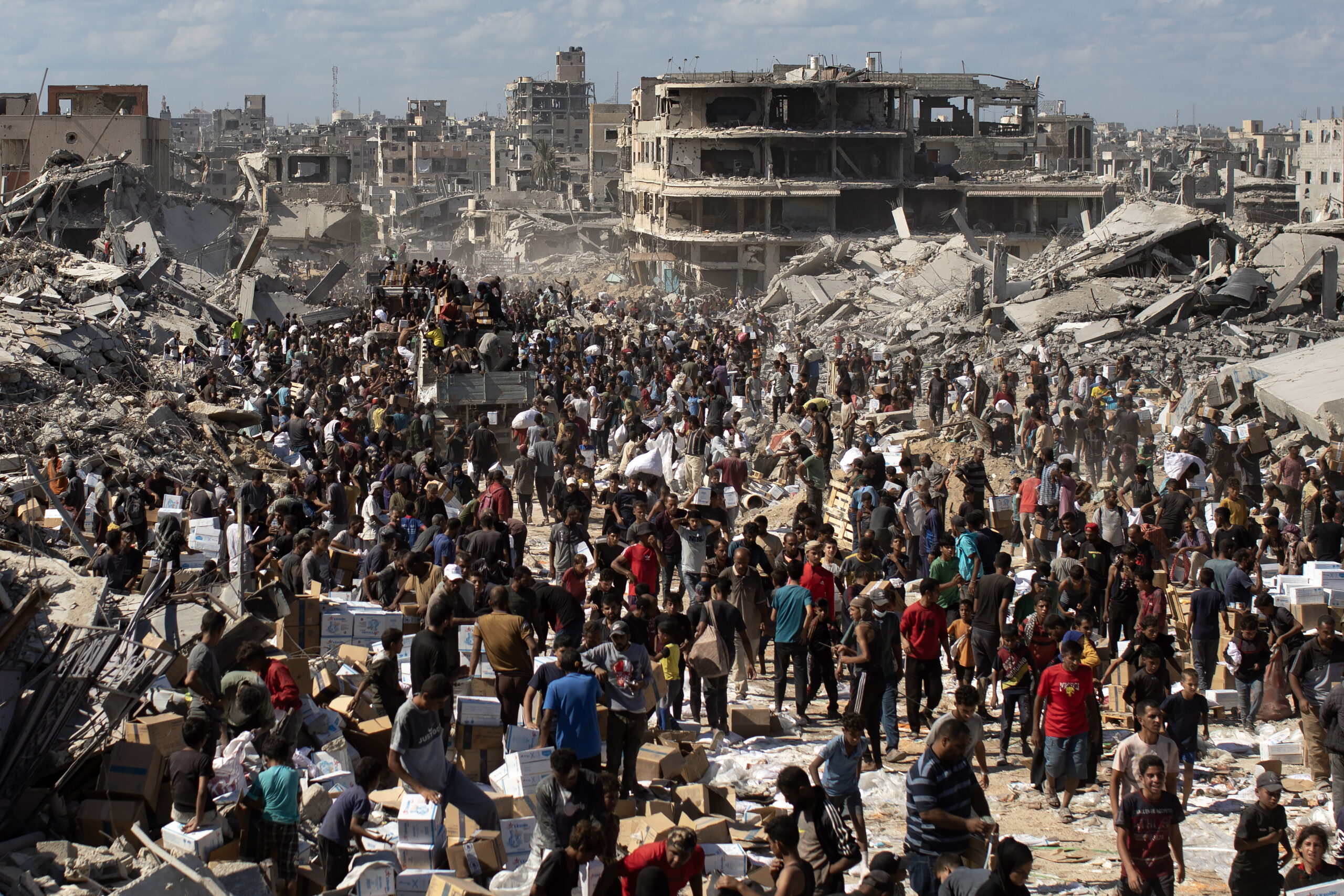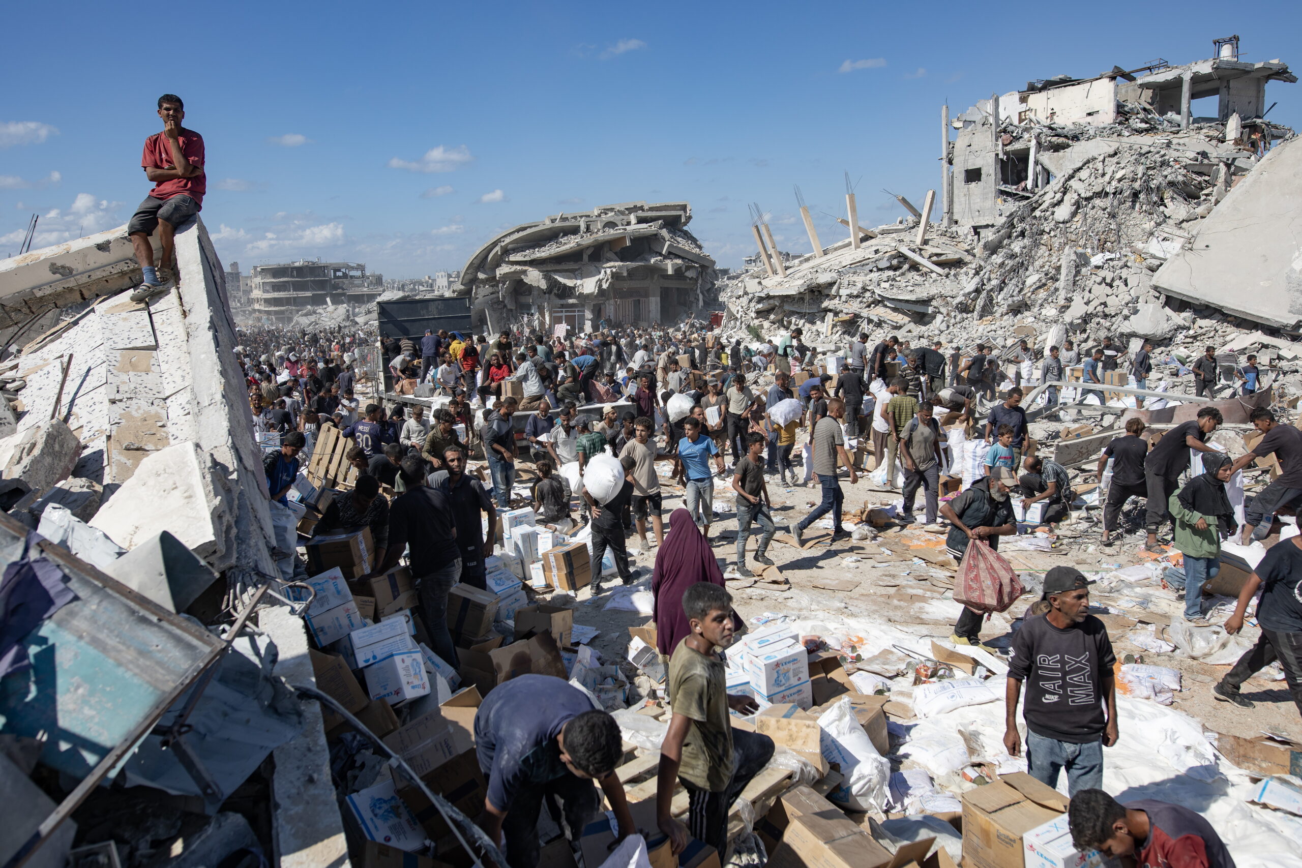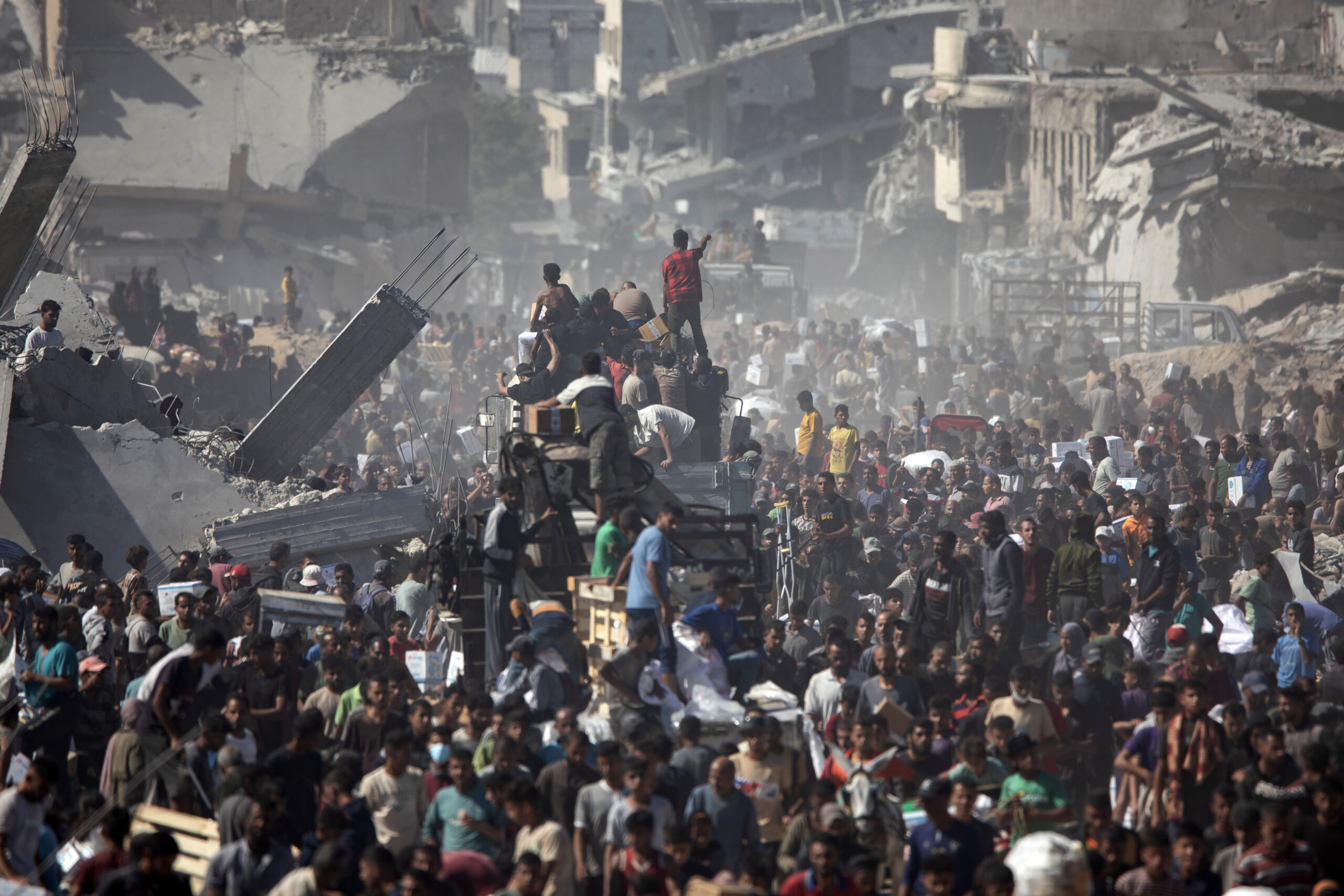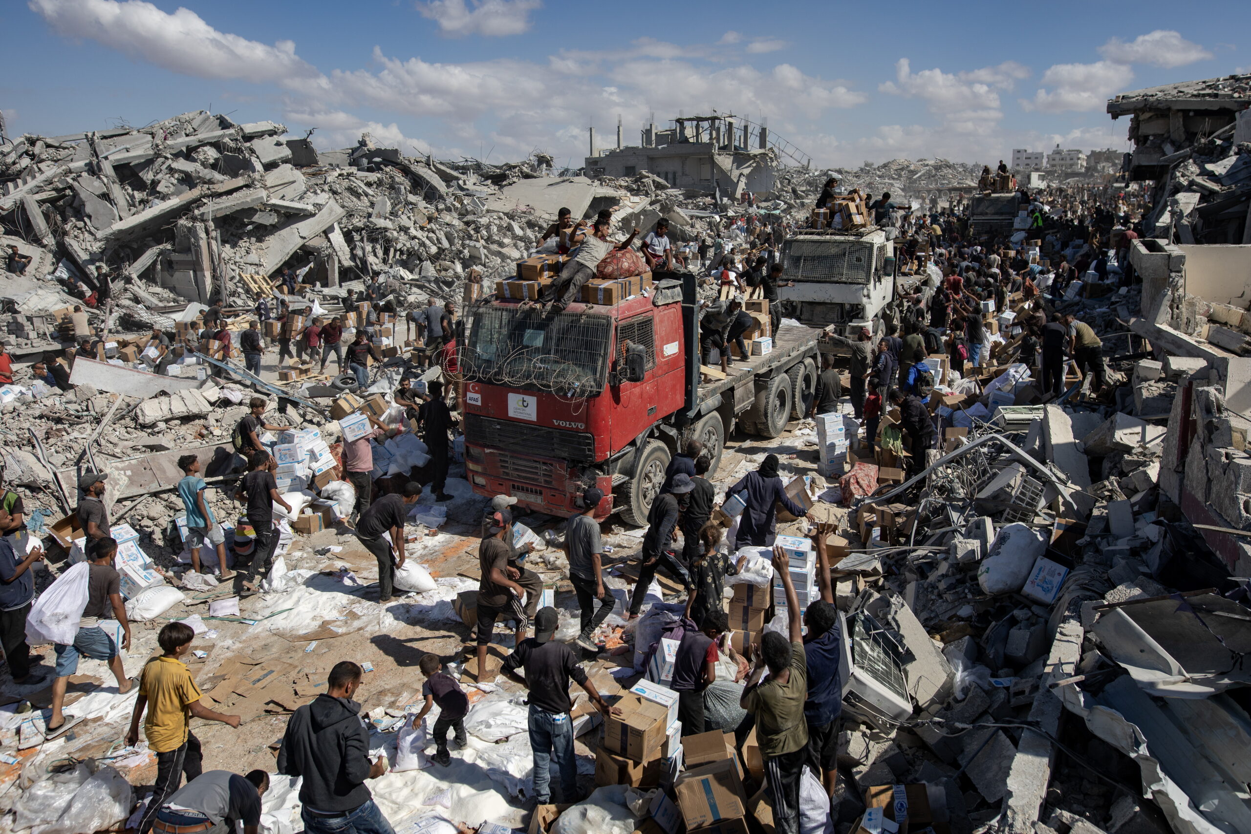 Οι φωτογραφίες είναι από τη Γάζα. Τραβήχτηκαν στις 11 και 12 Οκτωβρίου 2025 όταν ξεκίνησαν οι εκτοπισμένοι να επιστρέφουν στον τόπο τους – ή τουλάχιστο σε ό,τι απέμεινε απ’ αυτόν –  μετά και την επικύρωση της συμφωνίας για τερματισμό ενός πολέμου που κράτησε δύο χρόνια. Ανάμεσα στα χαλάσματα εκατοντάδες φορτηγά άρχισαν να καταφθάνουν την Κυριακή φορτωμένα ανθρωπιστική βοήθεια και από κάτω χιλιάδες «μη πεινασμένοι» με απλωμένα τα χέρια ελπίζουν πλέον… σε κάτι. (Πηγή φωτογραφιών: European Pressphoto Agency, EPA)