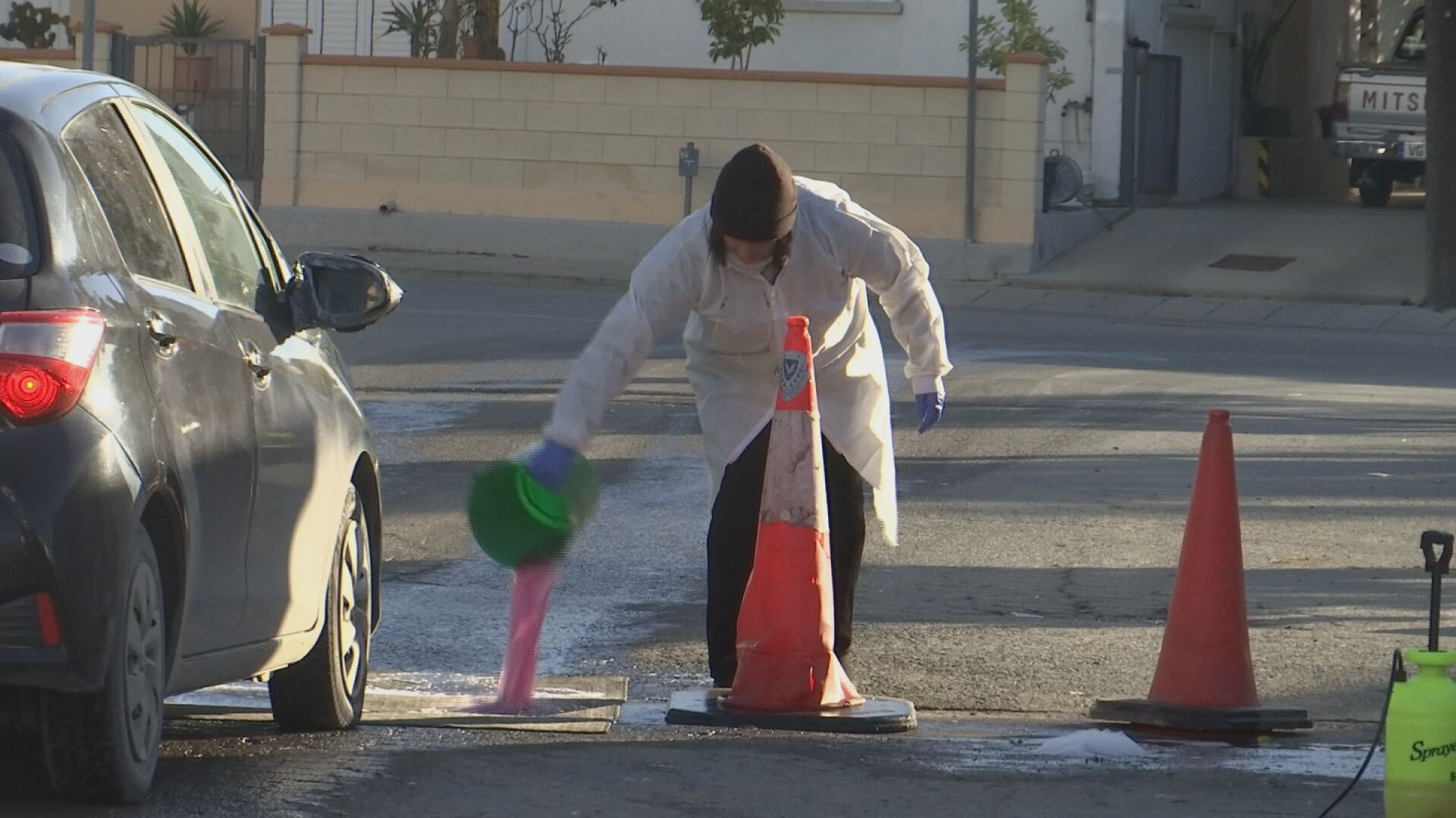 Όπως διακρίνεται, πέραν των ψεκασμών, έχει τοποθετηθεί ειδικό σφουγγάρι πάνω από το οποίο περνούν τα οχήματα για καλύτερη απολύμανση.