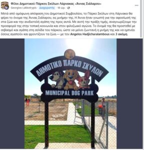 Στο έργο, στην προσφορά και στη μνήμη της Δημοτικής Συμβούλου Λάρνακας Άννας Σιάλαρου, αφιερώνει ο Δήμος Λάρνακας το Πάρκο Σκύλων της πόλης του Ζήνωνα που από σήμερα θα φέρει το όνομα της.