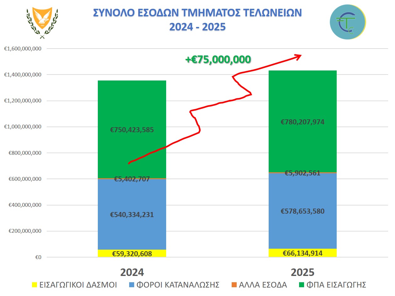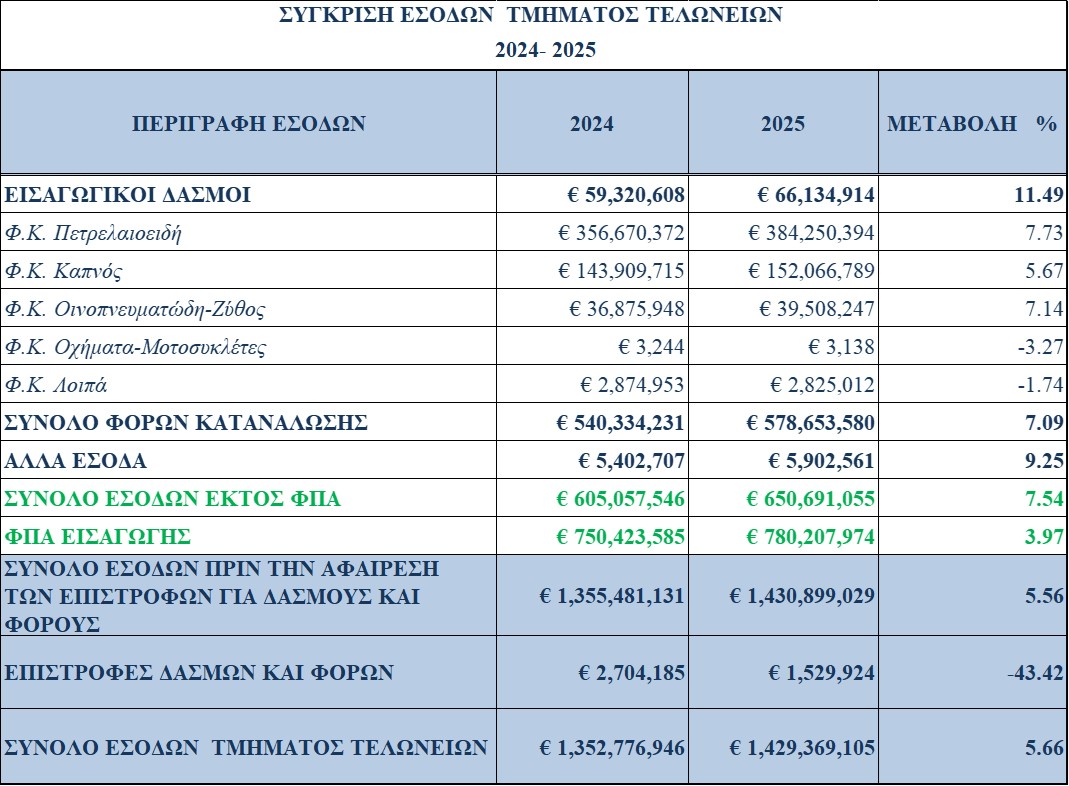 Το 2025 αποδεδειγμένα ήταν μια πολύ πετυχημένη και αποδοτική χρονιά για το Τμήμα Τελωνείων αφού κατά την υπό εξέταση χρονική περίοδο παρατηρήθηκε μια γενική αύξηση των εσόδων του Τμήματος κατά 5,6% σε σχέση με το 2024, η οποία σε απόλυτους αριθμούς σημαίνει την εισροή στα ταμεία του κράτους ποσού πέραν των 75 εκατομμυρίων ευρώ περισσότερα από το 2024.