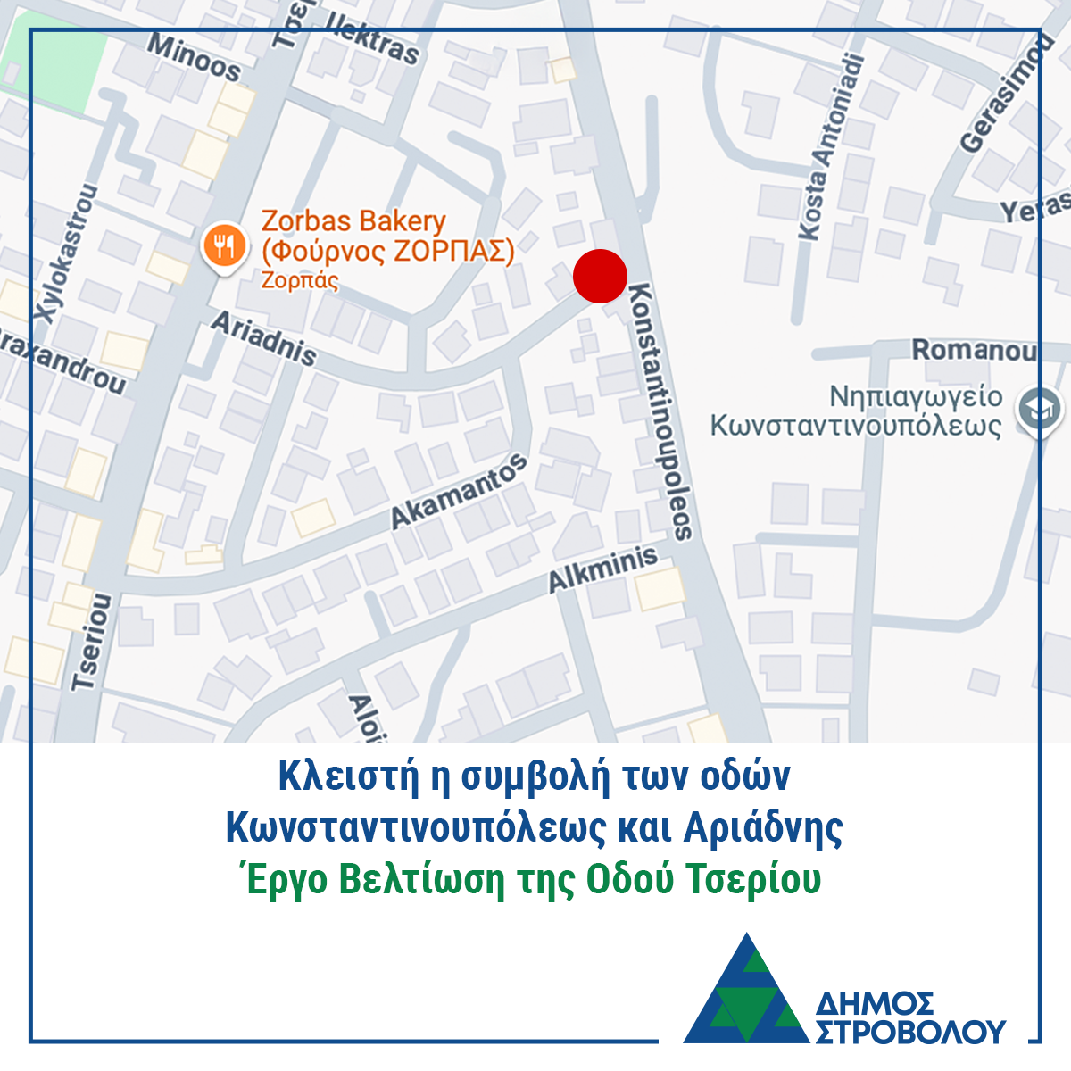Ο Δήμος Στροβόλου ενημερώνει το κοινό ότι από την Κυριακή 16 Νοεμβρίου 2025, από τις 06:00 π.μ μέχρι τις 17:00 μ.μ  θα πραγματοποιούνται κατασκευαστικές εργασίες στην συμβολή της οδού Αριάδνης με την οδό Κωνσταντινουπόλεως.