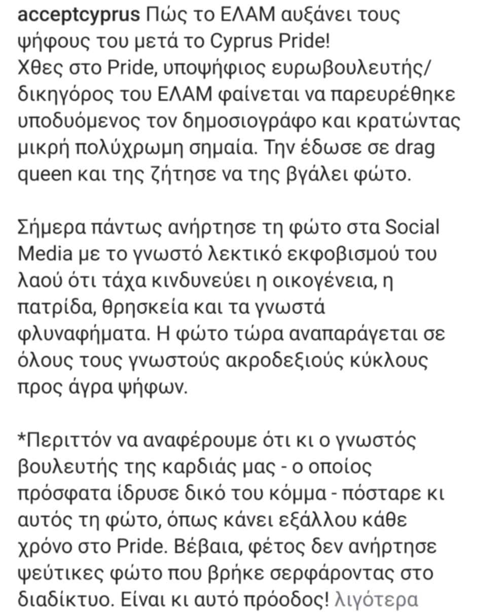 Η Accept Κύπρου υποστηρίζει ότι ο εν λόγω πολιτικός ήταν παρών στην εκδήλωση Pride και «ξεγέλασε» την drag queen για να την απαθανατίσει, προφασιζόμενος ότι ήταν δημοσιογράφος.