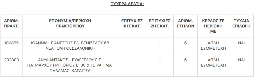 Δύο τυχερά δελτία βρέθηκαν στη 2η κατηγορία (5), τα οποία κερδίζουν το ποσό των €100.000,00 για κάθε επιτυχία.