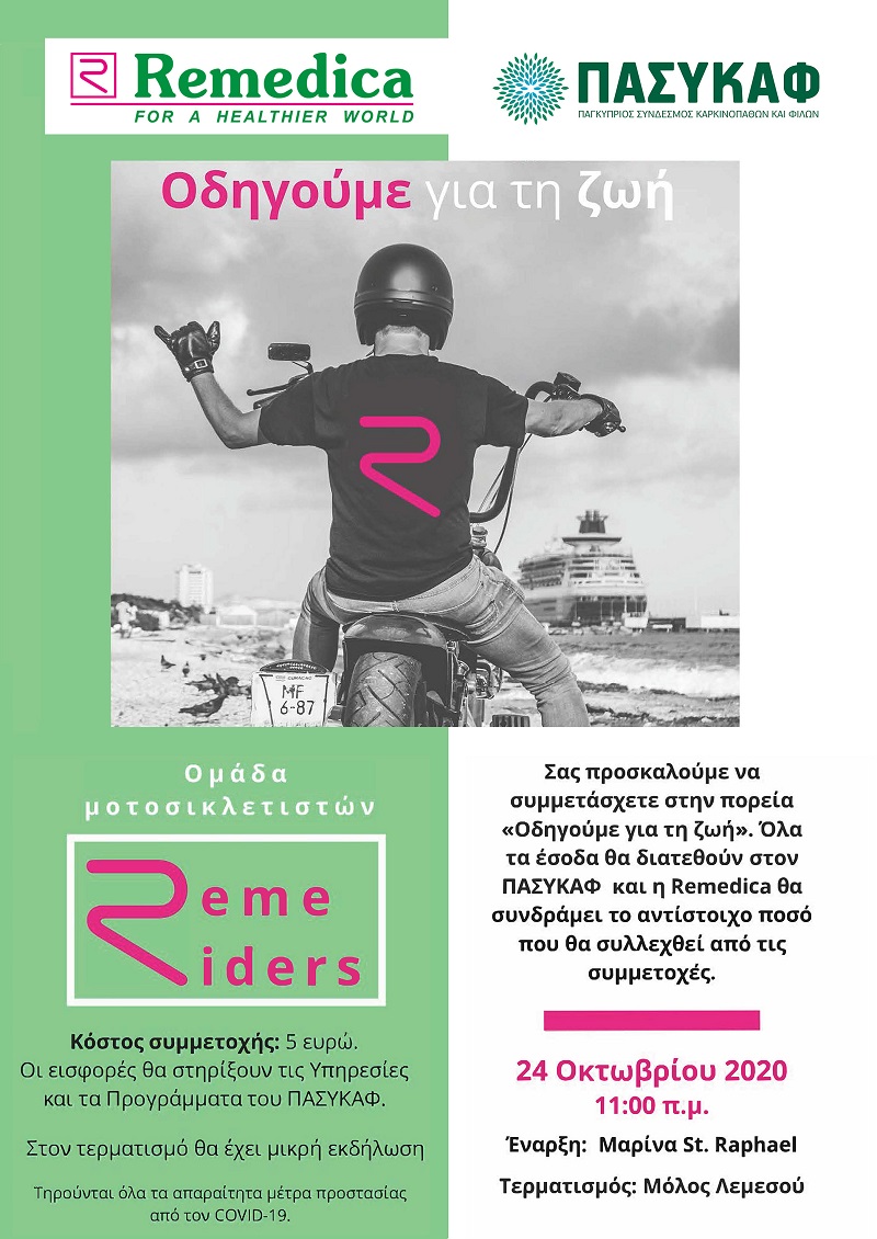 Σας προσκαλούμε να συμμετάσχετε στην πορεία «Οδηγούμε για τη ζωή». Όλα τα έσοδα θα διατεθούν στον ΠΑΣΥΚΑΦ και η Remedica θα συνδράμει το αντίστοιχο ποσό που θα συλλεχθεί από τις συμμετοχές.