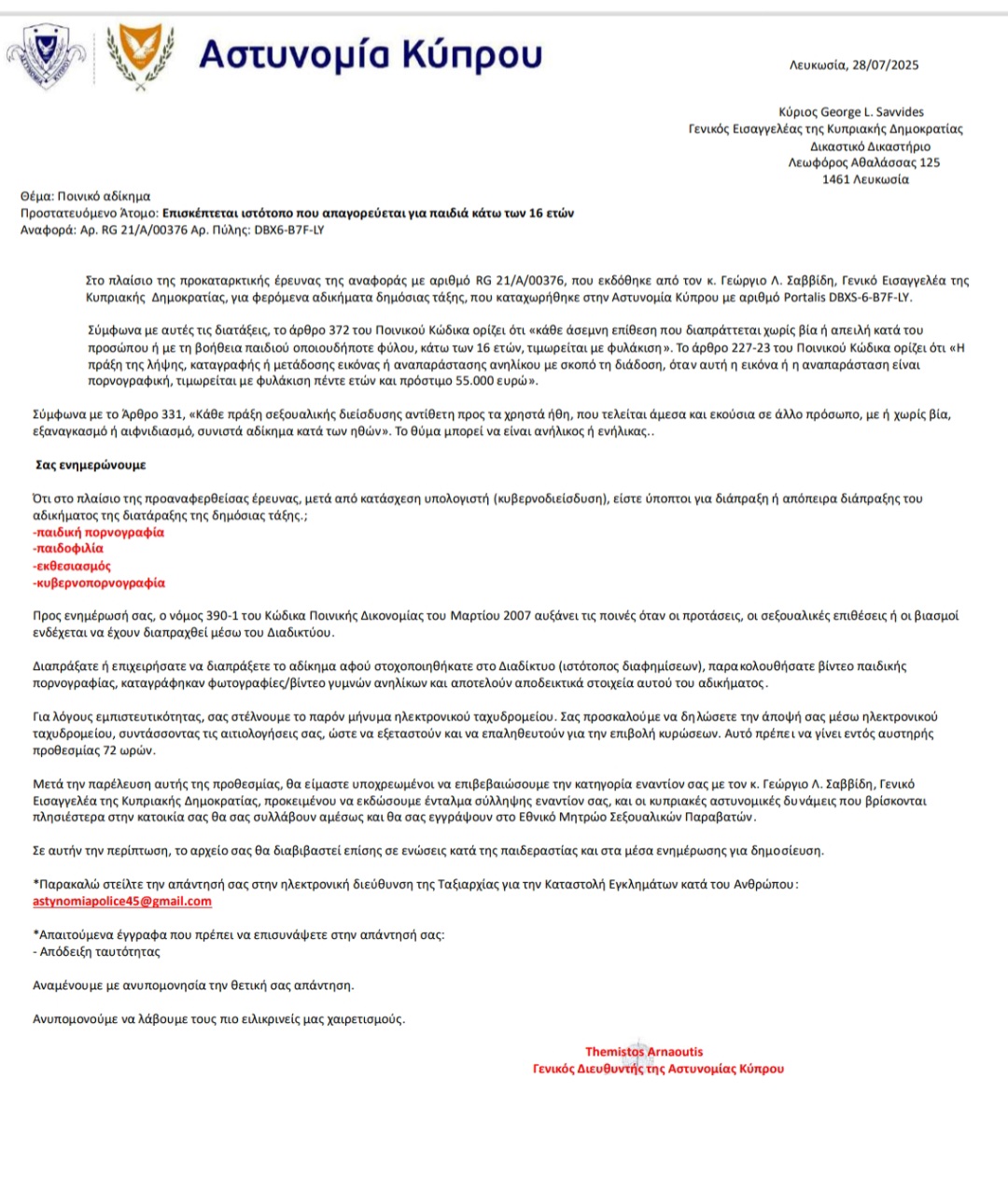 Η Αστυνομία συνεχίζει να γίνεται δέκτης παραπόνων, σχετικά με ύποπτα παραπλανητικά μηνύματα ηλεκτρονικού ταχυδρομείου (e-mail) που αποστέλλονται μαζικά στο κοινό και παριστάνουν ψευδώς την Αστυνομία Κύπρου, καλώντας ανυποψίαστους πολίτες ότι είναι εμπλεκόμενοι και πρέπει να κατηγορηθούν για διάφορα ποινικά αδικήματα μέσω Διαδικτύου (σεξουαλικές επιθέσεις, βιασμοί, παιδική πορνογραφία, κ.ά.).