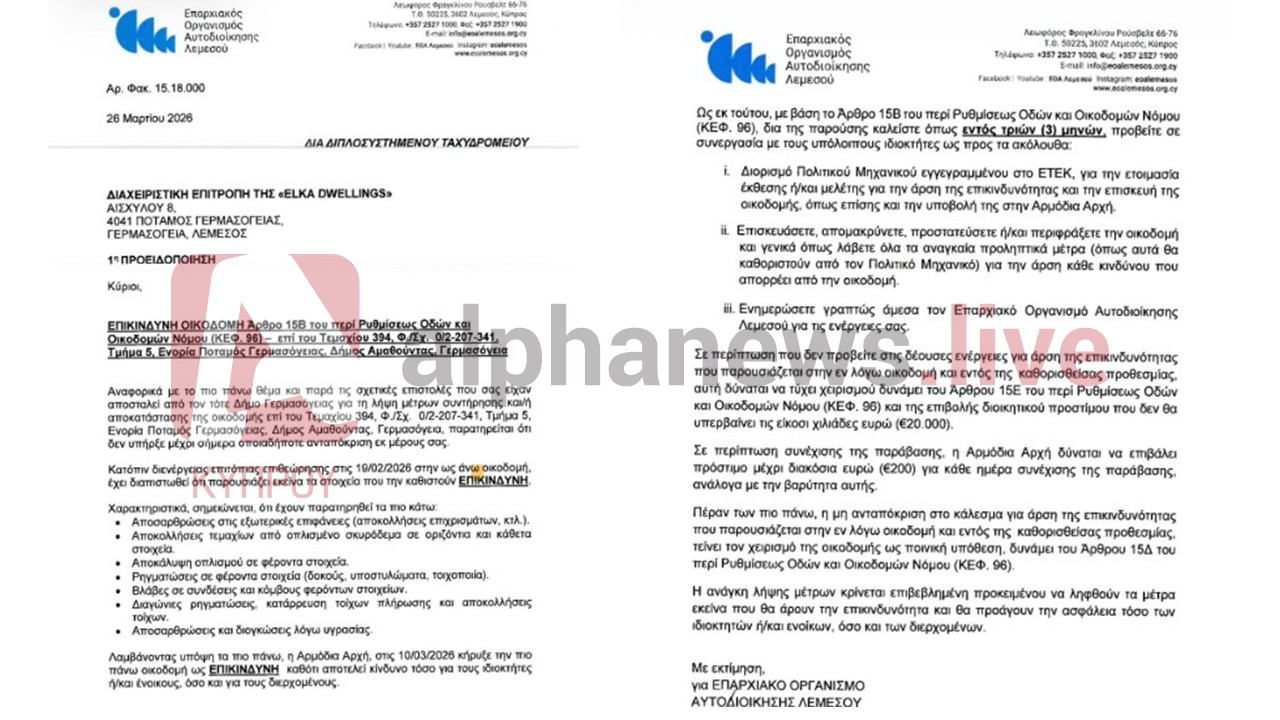 «Η Αρμόδια Αρχή κήρυξε 10/3/26 την πιο πάνω οικοδομή ως ΕΠΙΚΥΝΔΥΝΗ καθότι αποτελεί κίνδυνο για τους ιδιοκτήτες ή ενοίκους όσο και τους διερχομένους. Εντός τριών μηνών καλείστε να προβείτε σε διορισμό πολιτικού μηχανικού. Επισκευάστε, απομακρύνετε, προστατεύεστε ή και περιφράξτε την οικοδομή και λάβετε αναγκαία προληπτικά μετρά. Ενημερώστε γραπτώς άμεσα τον ΕΟΑ για τις ενέργειές σας».