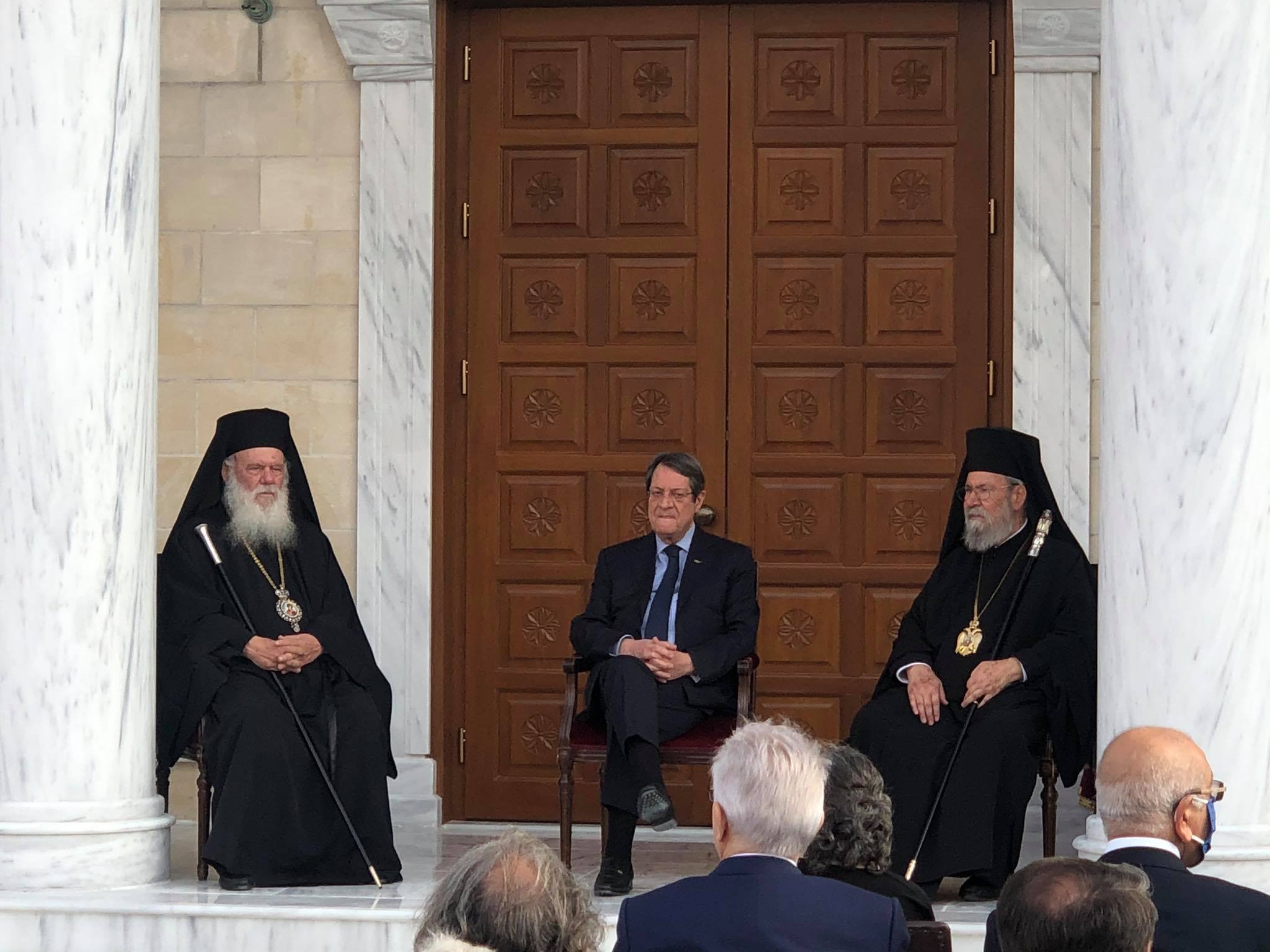 Τελέστηκε απόψε, παρουσία του Αρχιεπισκόπου Αθηνών Ιερώνυμου, του Προέδρου της Δημοκρατίας Νίκου Αναστασιάδη, του κλήρου και λαϊκών, ο εσπερινός των εγκαινίων του νέου Καθεδρικού Ναού του Αποστόλου Βαρνάβα, κοντά στην Αρχιεπισκοπή.