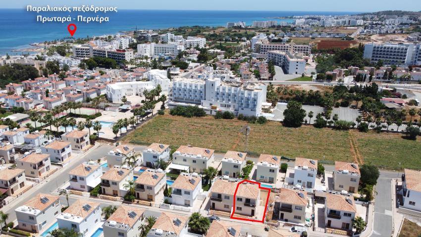 Διώροφη εξοχική κατοικία τριών υπνοδωματίων με ιδιωτικό χώρο στάθμευσης. Με εσωτερικό χώρο περί τα 130 τ.μ. μαζί με καλ. βεράντα 6 τ.μ. και ακάλυπτες βεράντες 26 τ.μ. Το κατάλυμα βρίσκεται στην περιοχή Περνέρα στον Πρωταρά. Η εξοχική κατοικία είναι μέρος ενός συγκροτήματος 27 σπιτιών, το οποίο εφάπτεται της λεωφόρου Περνέρα και βρίσκεται περίπου 400 μ. από την παραλία και περίπου 2 χιλιόμετρα από την περιοχή του Πρωταρά. Η άμεση περιοχή του ακινήτου χαρακτηρίζεται κυρίως από οικιστικές μονάδες όπως κατοικίες και συγκροτήματα διαμερισμάτων.