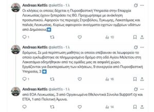 Ο κύριος Κεττής ενημερώνει επίσης ότι μαθήτες οι οποίοι επέβαιναν σε λεωφορείο το οποίο εγκλωβίστηκε σε πλημμυρισμένο δρόμο στη οδό Αγίου Μελετίου στη Λακατάμια, οδηγήθηκαν από τις ομάδες της Πυροσβεστικής Υπηρεσίας σε ασφαλή χώρο.