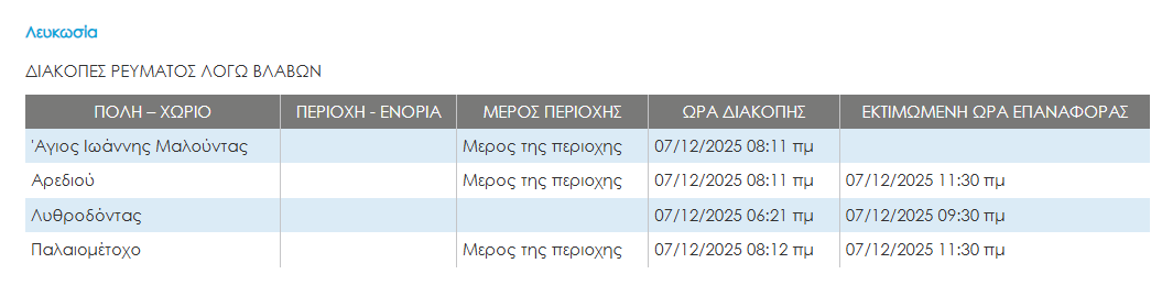 Σύμφωνα με την εκπρόσωπο Τύπου της ΑΗΚ Χριστίνα Παπαδοπούλου, πρόκειται για βλάβη στο δίκτυο μέσης τάσης, με τα συνεργεία να προσπαθούν για τον εντοπισμό και την επιδιόρθωση της βλάβης το συντομότερο δυνατό.